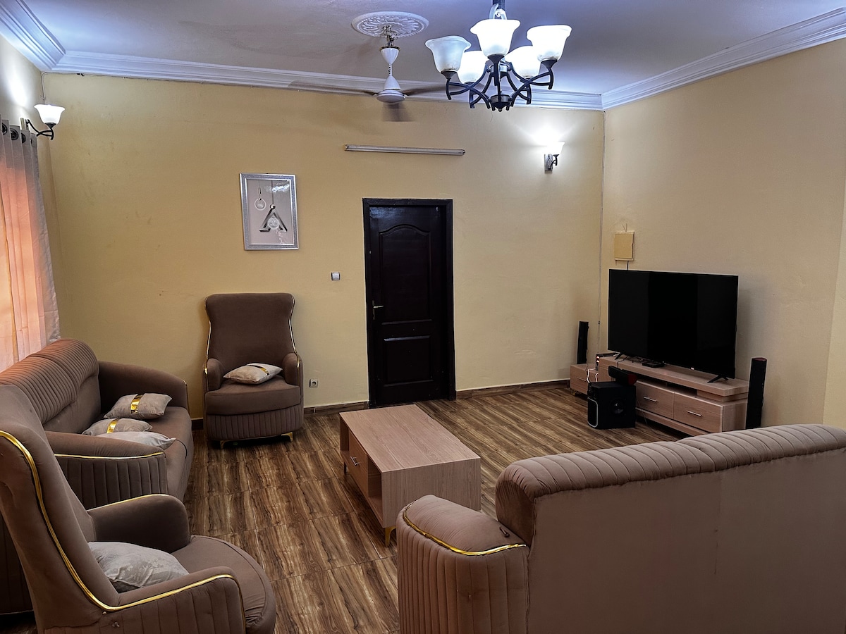 Villa meublée haut standing à Niamey, juste à côté du restaurant Le Moulin et en face de la Sécurité 227. Elle dispose de 4 chambres spacieuses avec salle de bain privée et climatisation, un grand salon moderne avec TV et canapé confortable, une salle à manger et une cuisine entièrement équipée (frigo, micro-ondes, gaz, chauffe-eau, cafetière). Deux terrasses, Internet et sécurité H24 avec gardien. Tarif : 50 000 F CFA / 24h.
