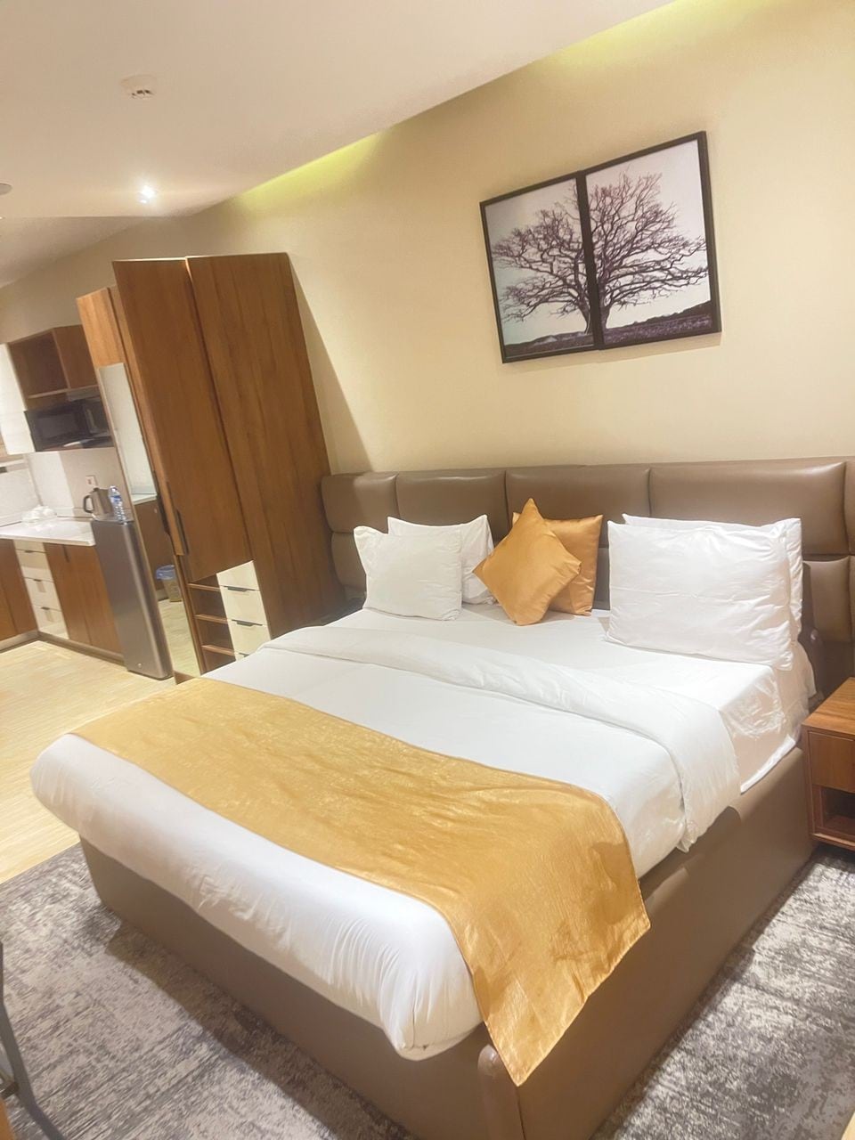 Spacious sitting room and royal ensuite room with Super king bed, modern bathroom and toilet 🚽. Very clean and standard apartment. Royal Pent House gives you all modern comfort beyond your imagination with unlimited high speed WiFi, 43inchSmart Tv in the bedroom and 55inch Smart Tv in the sitting room, YouTube, Netflix, DSTV. Comfortable Sofa, Water heater, Water kettle, Microwave, Cooking gas. Smoke Alarm, Mono dioxide Alarm, 24/7 power. , Cctv, maximum security with 24/7 security personnel