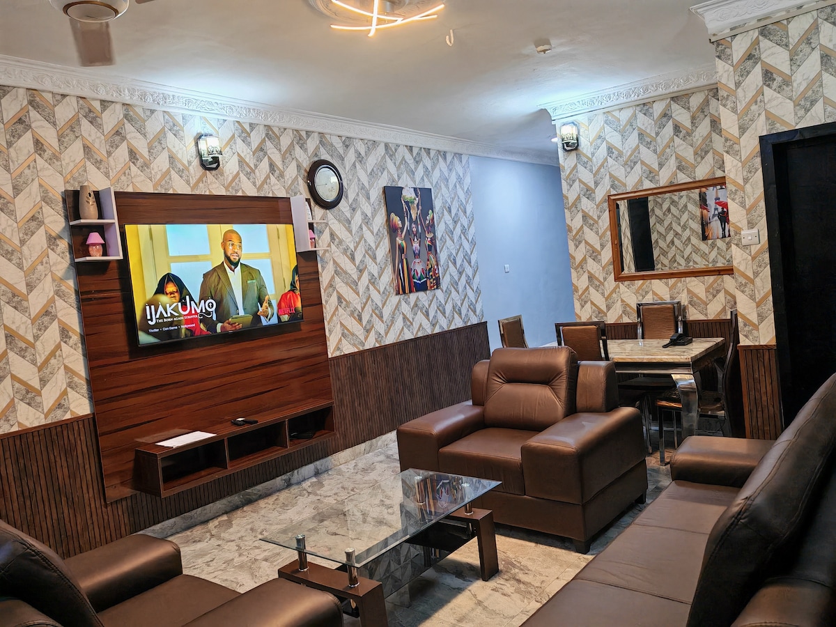 Standard ensuite room with semi orthopedic super king size comfortable mattress, modern bathroom with water heater. Unlimited fast WI-FI, 43inches Smart Tv in the bedroom and 55 inches Smart Tv in the sitting room, Netflix, YouTube, DSTV, Smoke alarm, 24/7 electricity with Band A supply frm the grid make my place unique wit no Blackout, Cctv, maximum security, 10min to International Airport and 5min to Domestic Airport. Sparkling clean, spacious and well organised Apartment for your comfort
