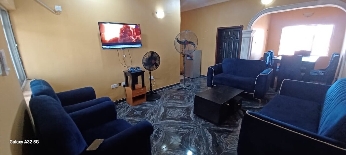 This facility is exquisitely furnished with nice and expensive funiture all the rooms have their own tv, and their is a playstation and a mini bar to cater for your needs. Their lightings are suparbly fitted with chandaliers in all the rooms and a great patio for the guest to relax