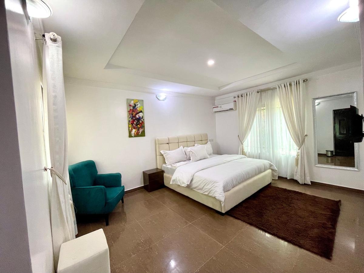 Forget the bustle of Abuja's cliche'd districts of Wuse, Maitama etc. and come find some peace and serenity in this gated neighborhood, cocooned within the Galadimawa - Lokogoma - Apo axis of the FCT. Wide paved roads (great for morning walks/runs!), fully covered drainage, and streets devoid of electric poles and cables (all neatly tucked away underground) provide you with a sense of sanity and order as you enter a home that has been intentionally designed to give you the rest you deserve.