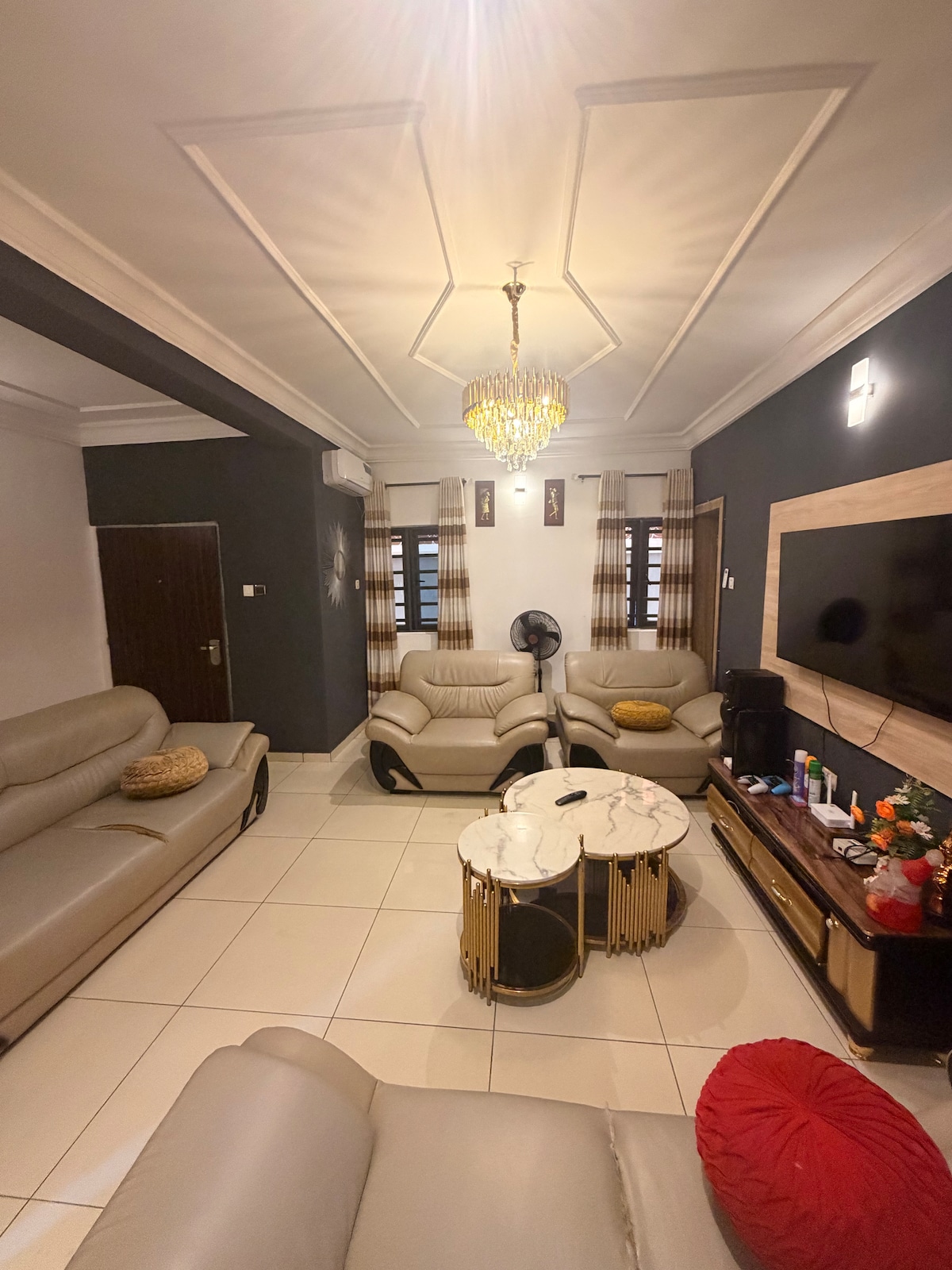 A beautifully designed contemporary house with six bedrooms across two floors. This large Abuja home can sleep up to 12 people in 6 separate king and queen size beds. The fully equipped kitchens are modern and spacious. With its cozy interiors, you will feel right at home from arrival. Have fun with the whole family and friends at this stylish place.