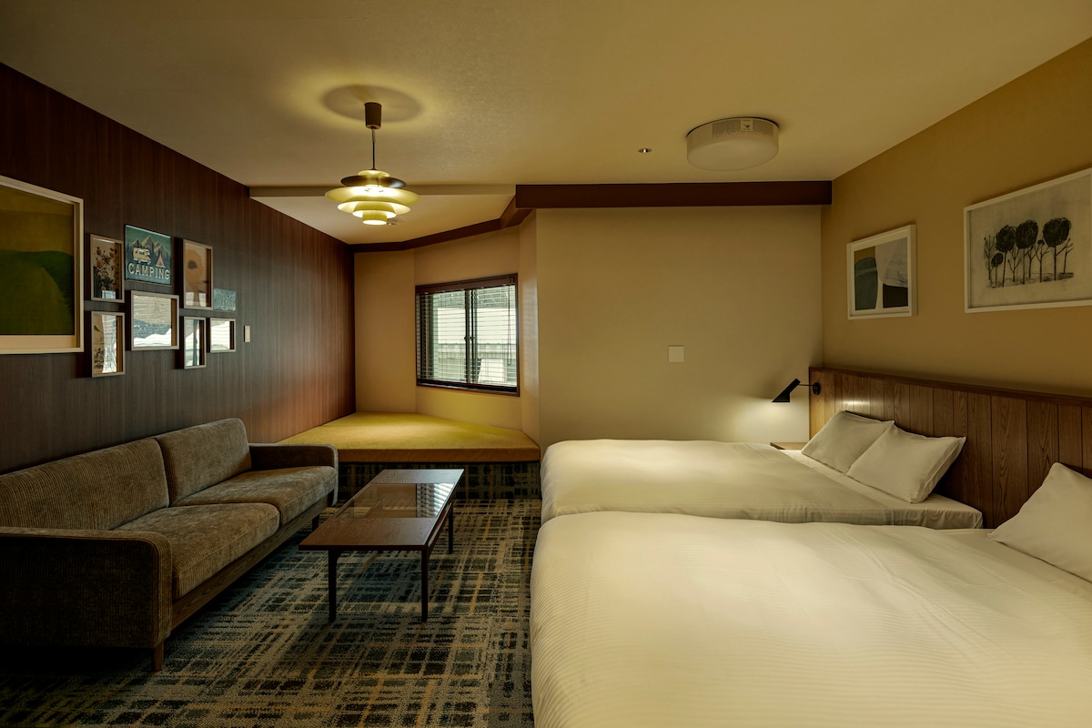 Welcome to the Yukiguma Lodge, a family-run Japanese-style hotel, offering private rooms with shared amenities. Enjoy the comfort of our cozy room with comfortable futons on traditional tatami flooring. The room features individual heating, ample storage, and access to high-speed Wi-Fi. {Up to 4 guests}