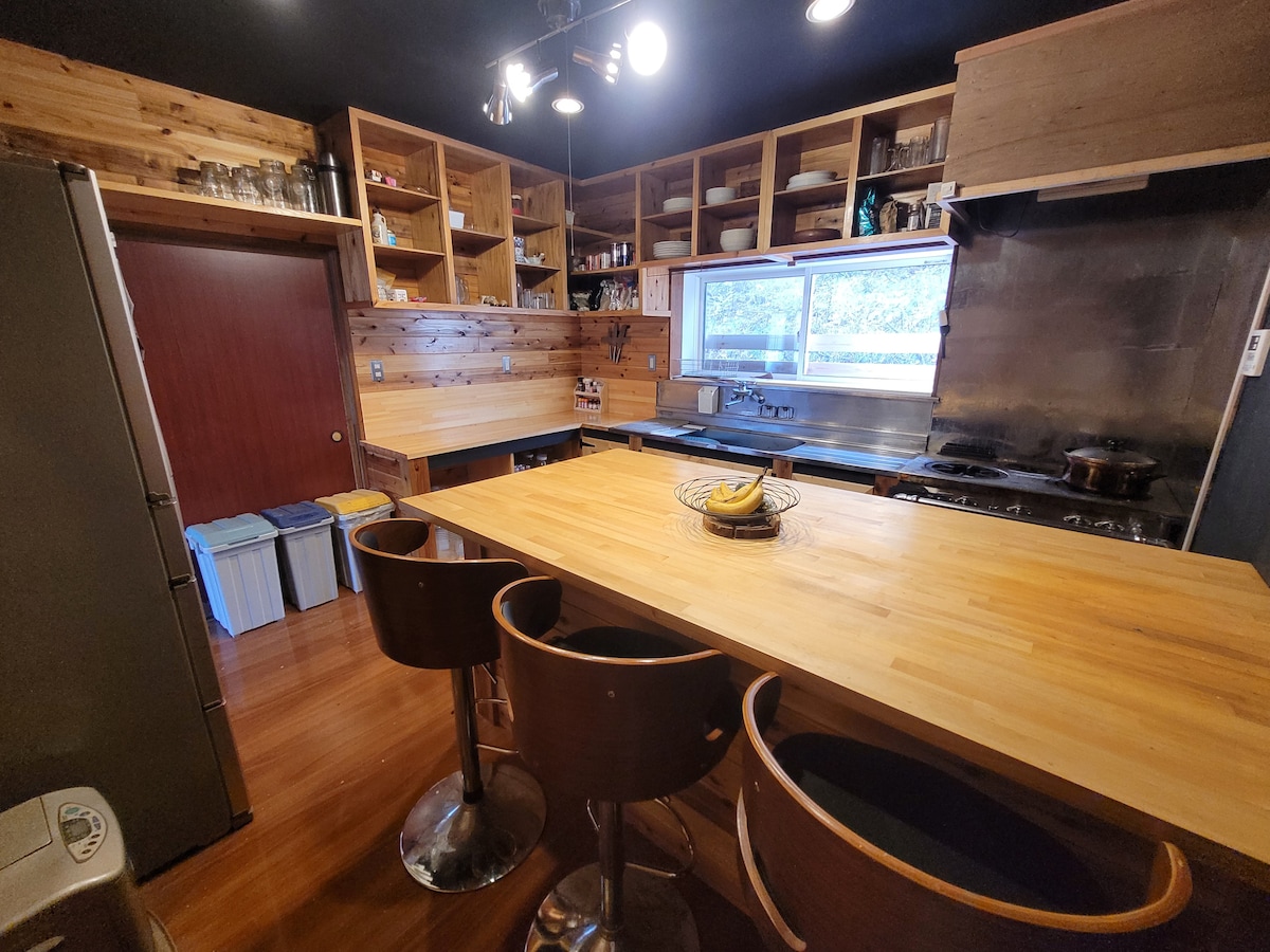 3-min walk to Fujiwara Ski Resort | 10-min drive to Takaragawa Onsen ♨️ Nestled among tall trees, Kokoro House is a 3-story wooden mountain chalet offering a warm, soulful stay for up to 14 guests, with retro, rustic charm and spacious lounges for relaxing and gathering. Ideal for families and groups of friends. Soak in the natural hot spring, surrounded by peaceful forest views. Enjoy slow mornings, fresh mountain air, and quiet moments in nature.