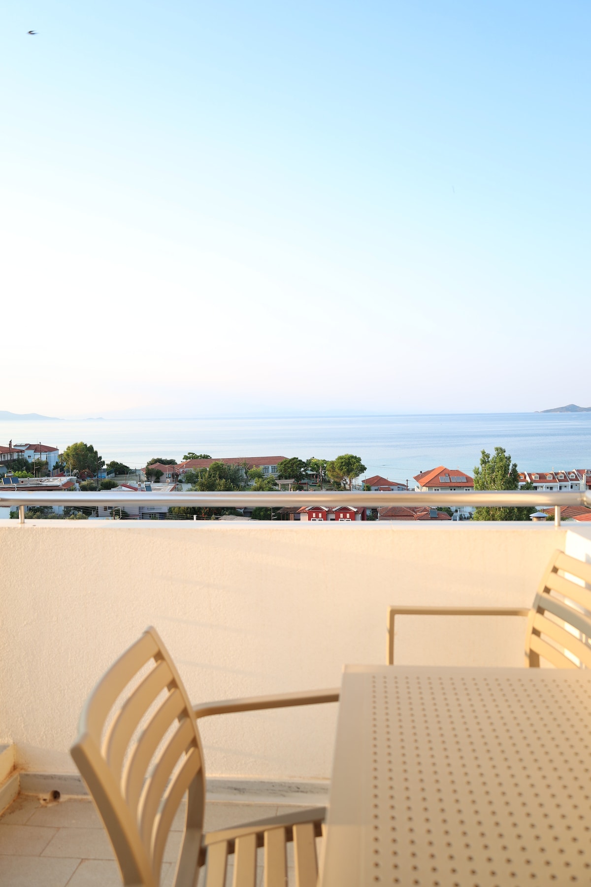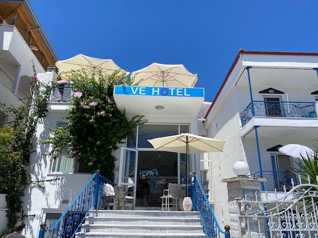The hotel is located on a hill in front and above the sea, offering its guests a unique view of the Aegean sea and sunset, fully furnished rooms/apartments of various sizes-studios or apartments and maisonettes with one, two, or three bedrooms from 2 up to 7 persons, quality full equipment, kitchen, a/c, tv in all rooms, pools, reception desk, free wi-fi, upon request daily cleaning service, laundry, breakfast, airport shuttle. Available breakfast directly to the room.