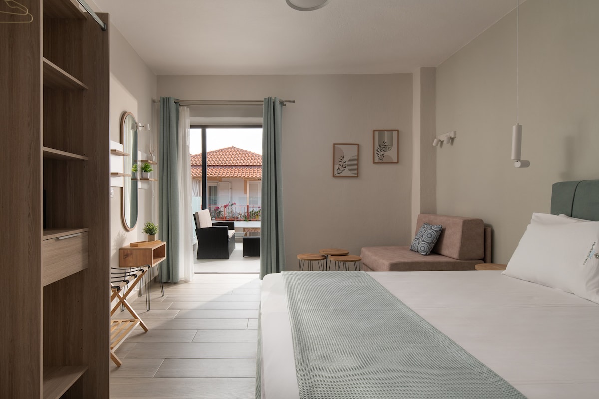 Όλα τα Μεγάλα Δωμάτια με Θέα Κήπο και Πισίνα αποτελούνται από έναν ενιαίο χώρο με δύο μονά και ένα διπλό κρεβάτι, κουζίνα, τηλεόραση LED , μαρμάρινο μπάνιο ντουζιέρα, πλήρως επιπλωμένο μπαλκόνι.