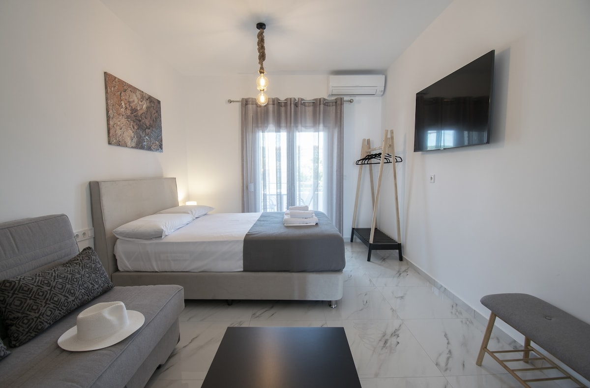 The Superior Double Studio on the 2nd floor offers a bright and cozy space ideal for couples. It features a comfortable double bed, a fully equipped kitchenette, a modern bathroom, and a private balcony with sea view. Enjoy A/C, free Wi-Fi, Smart TV, and easy access to the beach and promenade—perfect for a relaxing seaside getaway.