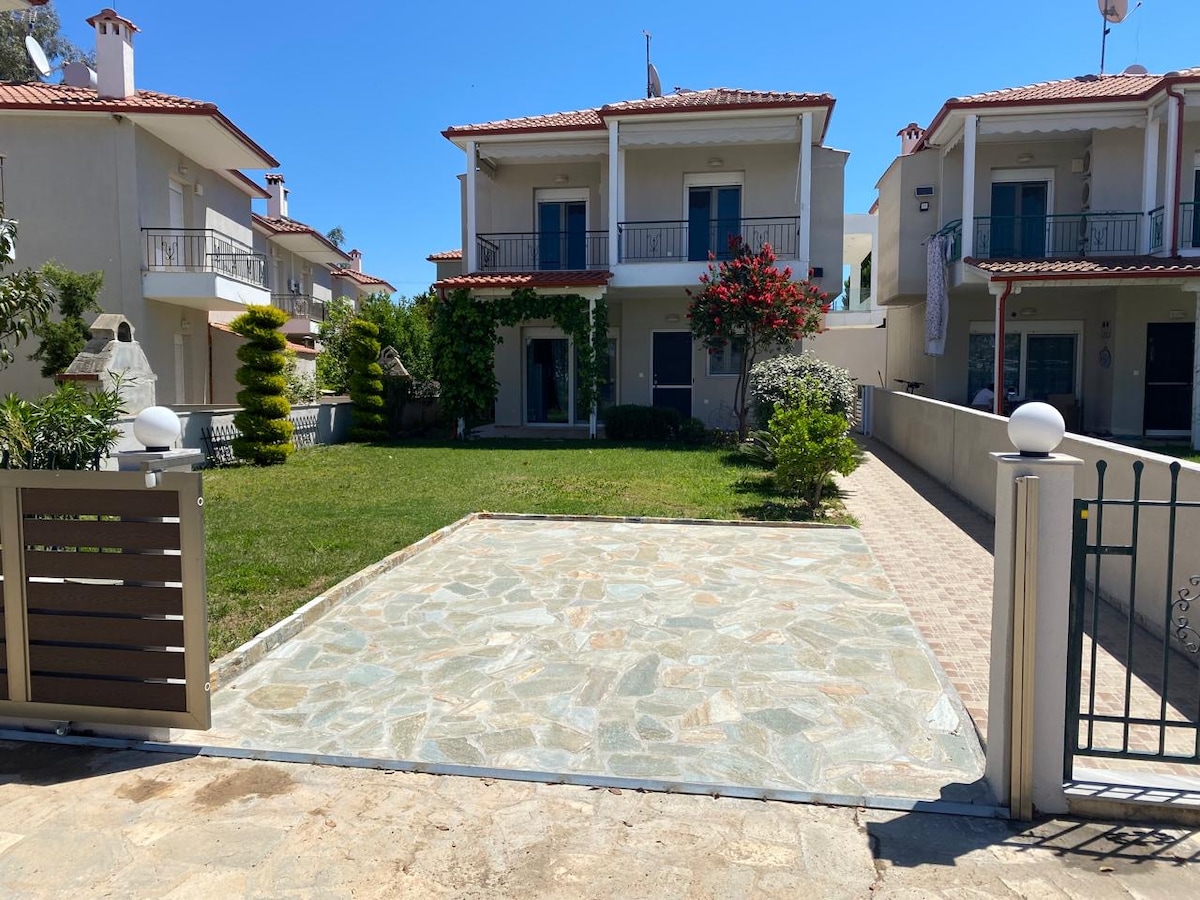 The villa is situated in front of one of the most beautiful, sandy beaches of Chalkidiki, in the second peninsula! Beach front, and close to everything that you will need while on holidays! Cafe bars, super market, restaurants are located in less than 1 kilometers We hope that our guests will feel like home. Our house is ideal not only for a family but also for larger groups of friends. The house is also friendly for families with kids as there is a lot of space for them to play.