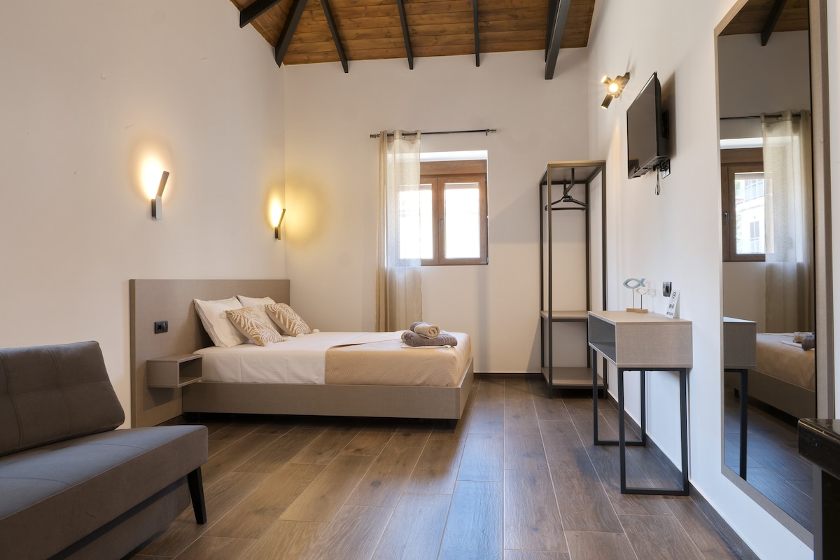 Το τρίκλινο αυτό δωμάτιο βρίσκεται στο ισόγειο, εχει βεράντα η οποία βλέπει στον γραφικό πεζόδρομο του χωριού. Ο κυρίως χώρος διαθέτει ένα διπλό κρεβάτι και ενα μονό κρεβάτι. Μεγάλη ιδιωτική βεράντα, όπου μπορείτε να πάρετε το πρωινό σας και όλα τα γεύματα της ημέρας. -Δωρεάν δυνατό Wi-Fi. -Κατόπιν αιτήματος, παρέχονται βρεφική κούνια και σίδερο.
