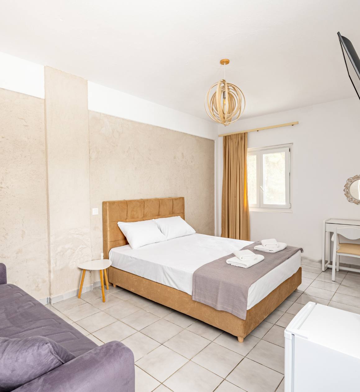 The hotel is located on a hill in front and above the sea, offering its guests a unique view of the Aegean sea and sunset, fully furnished rooms/apartments of various sizes-studios or apartments and maisonettes with one, two, or three bedrooms from 2 up to 7 persons, quality full equipment, kitchen, a/c, tv in all rooms, pools, reception desk, free wi-fi, upon request daily cleaning service, laundry, breakfast, airport shuttle. Available breakfast directly to the room.