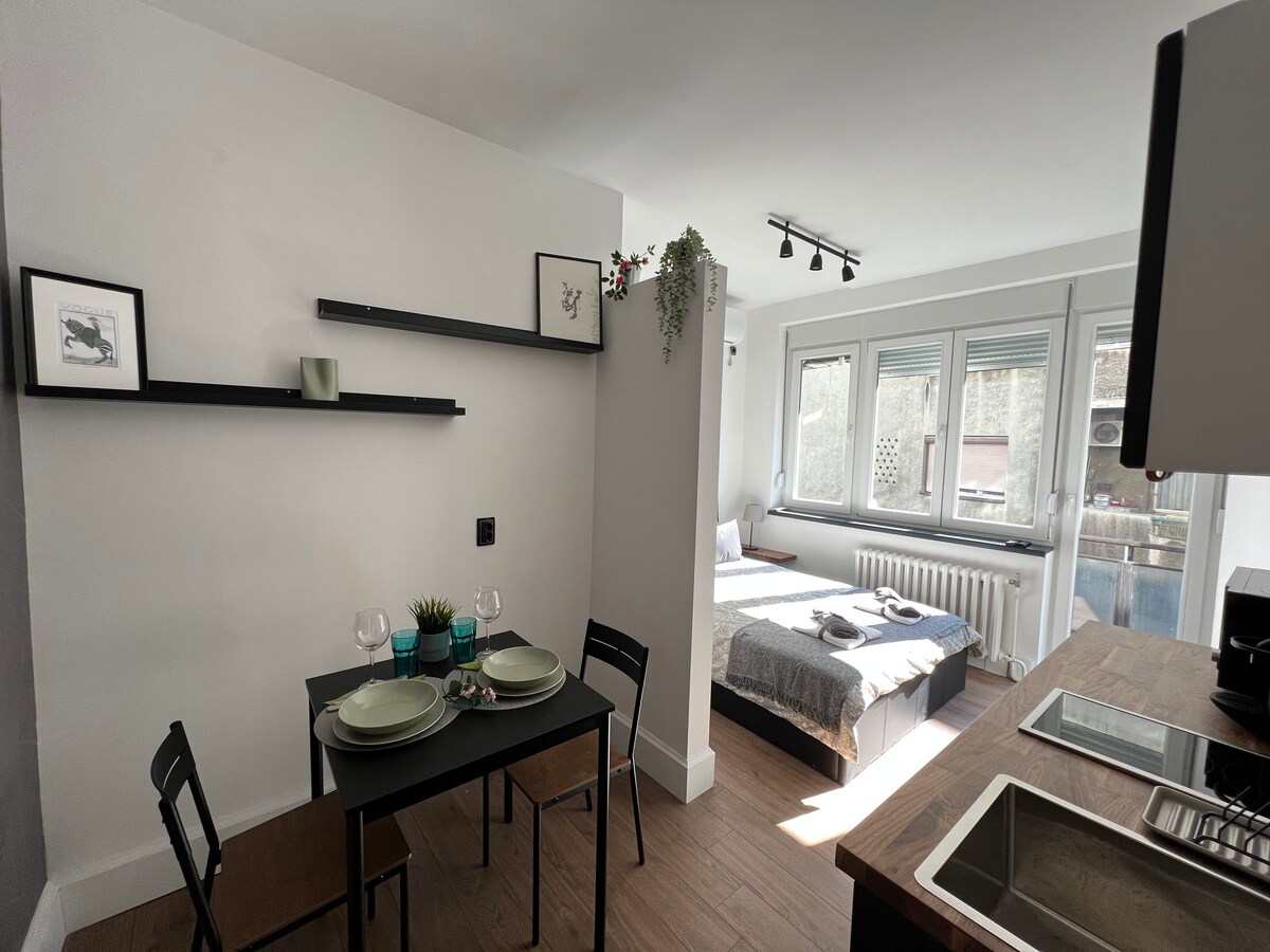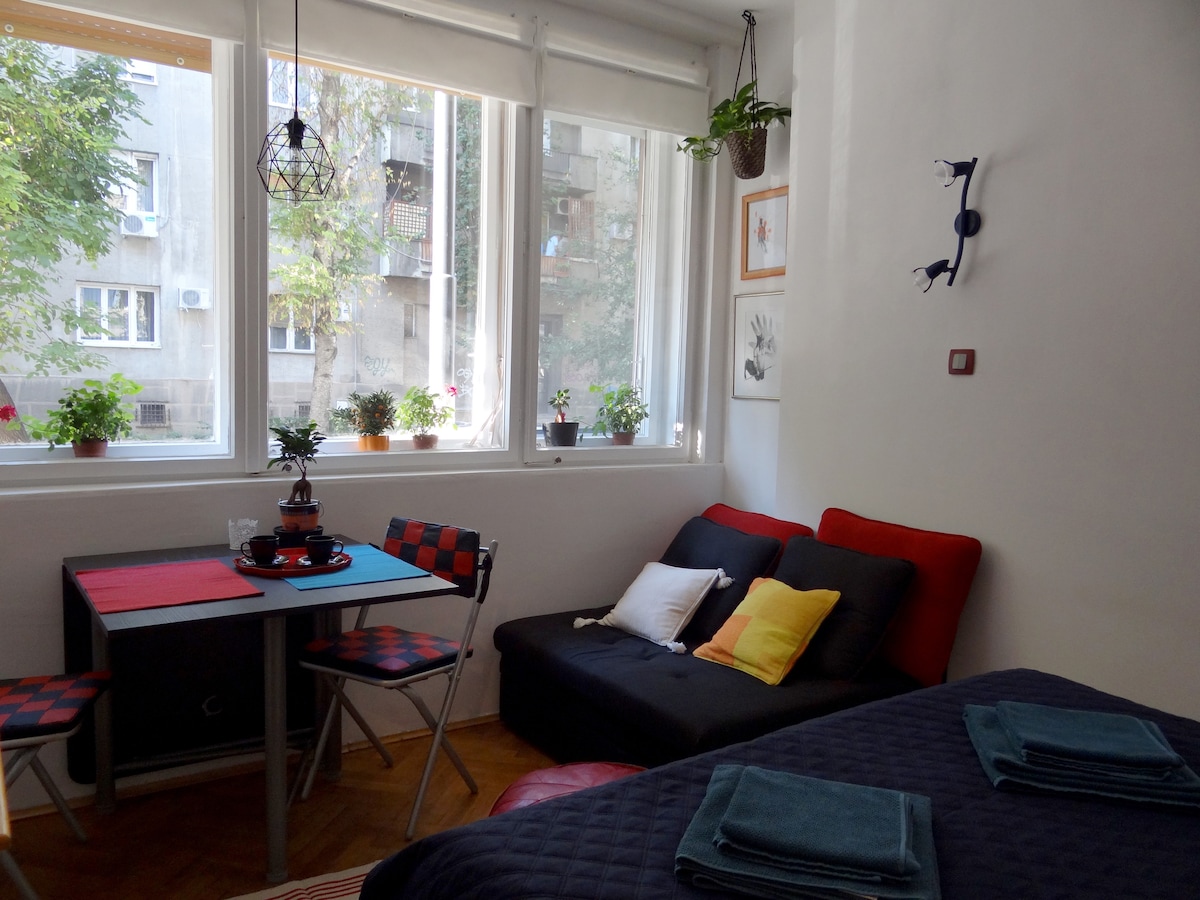 Lovely modern apartment, newly renovated is located in the city center, near Slavija Square and Hilton Hotel. It is on the second floor of a five-storey building. The apartment consists of a spacious room with dining area, kitchen and a bathroom. It is suitable for those who are travelling for business or on holiday. The apartment is oriented towards the beautiful yard with a lot of trees which makes it quiet and good for rest.