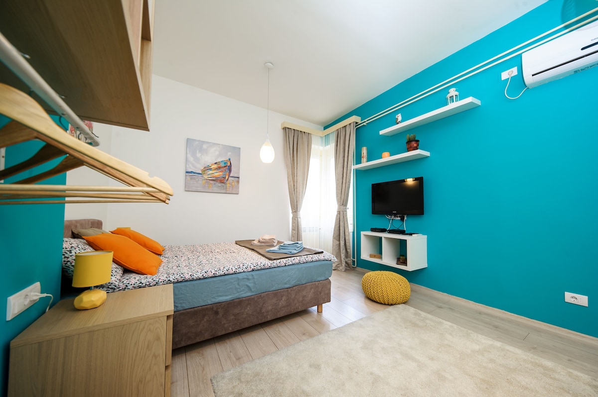 The apartment is full renovated a few months ago and everything is brand new. In the bedroom there is a large comfortable double bed and one big sofa bed in the living room. All in discreet led light. In the kitchen you can enjoy a modern flat-screen cooker, oven, refrigerator with freezer, dishwasher and washing machine and a large bar table. The bathroom is glazed with marble ceramics, it is very compact and clean. The bathroom is equipped with a hairdryer, towels, hygiene sets.