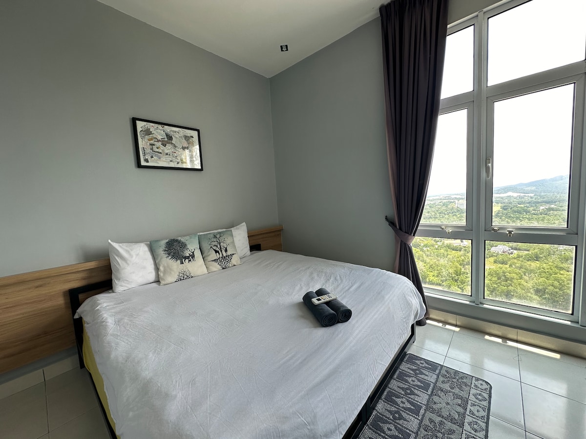 Relax in this cozy, fully equipped, stylish studio in a new premier apartment block near KLIA. Next to Mesamall with groceries, eateries, cinema & more. Enjoy a king bed, 200Mbps WiFi, 43” Google TV, kitchenette, dining & work tables—perfect for rest or remote work. Relax at the infinity pool with mountain views, stay fit in the full gym, or unwind at the rooftop area with stunning views. Ideal for short or long stays. Whether flying in or working remotely, this space feels like home