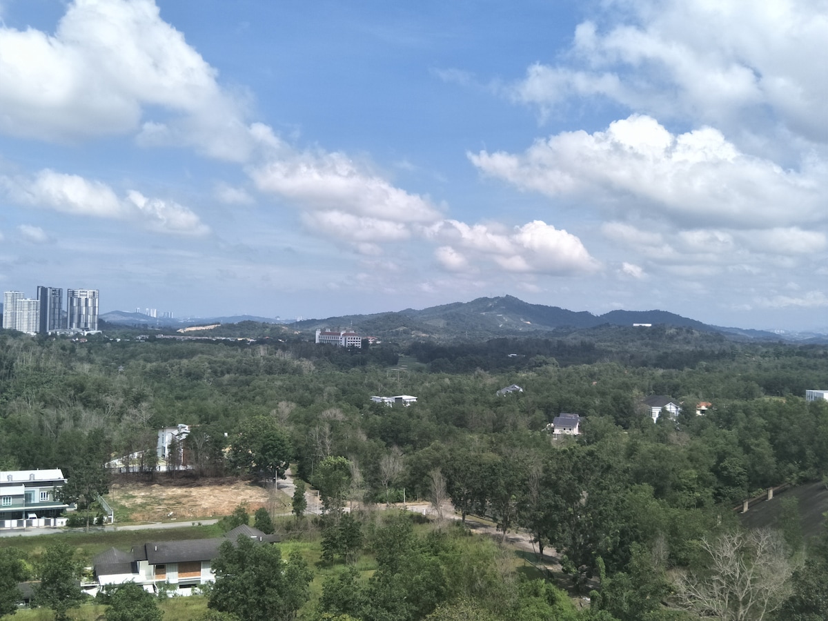 Relax in this cozy, fully equipped, stylish studio in a new premier apartment block near KLIA. Next to Mesamall with groceries, eateries, cinema & more. Enjoy a king bed, 200Mbps WiFi, 43” Google TV, kitchenette, dining & work tables—perfect for rest or remote work. Relax at the infinity pool with mountain views, stay fit in the full gym, or unwind at the rooftop area with stunning views. Ideal for short or long stays. Whether flying in or working remotely, this space feels like home