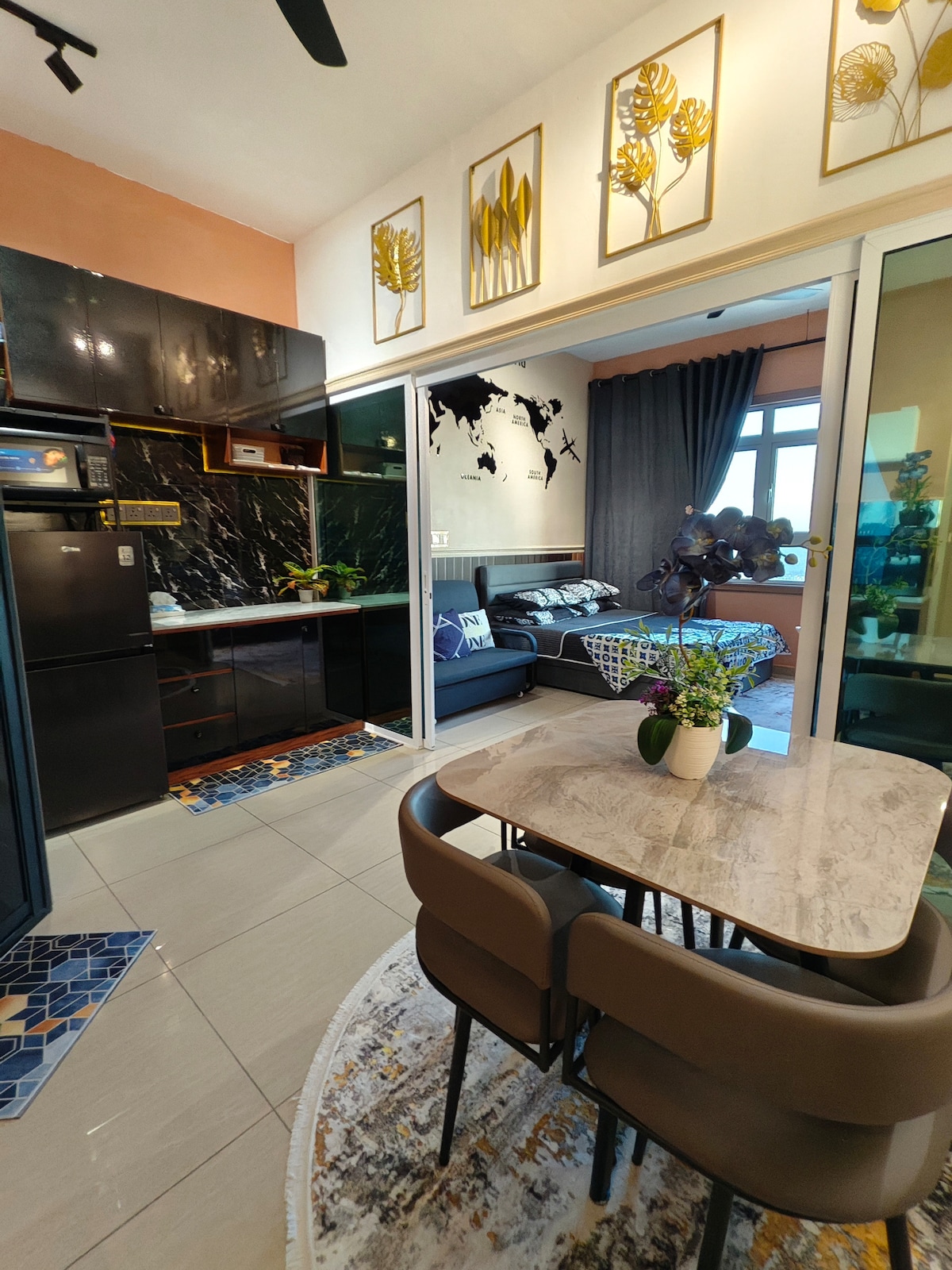 Explore our cozy studio, which can accommodate 2 to 3 people with a queen bed and a sofa bed. Only a 15-minute drive from KLIA T1/T2, the place is surrounded by many restaurants, fast food branches, groceries, and laundry shops, all within walking distance. Savor all the amenities, including the kids’ playground, BBQ area, gym, and swimming pool, with 24/7 security. * Unavailable drop your luggage before check in hours.Due to building designed, need to walk 10 steps staircase to get elevator.