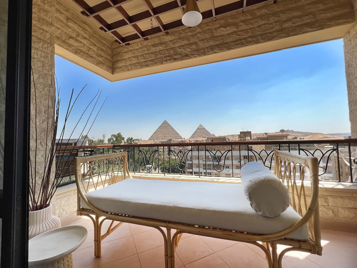 Big apartment ( 150 M² ) has a Jacuzzi with Pyramids view in OLD GIZA ( Nazlet El-Samman ) in small street , the apartment is full with antique furnitures & salt lamps for positive energy, apartment has 2 big suites, each suite has an attached bathroom, the balcony is about 30 metres square and there is an elevator, there is hot water and Air-condition .. very good internet.. There is free breakfast, water, coffee & tea, also you can use the washing machine