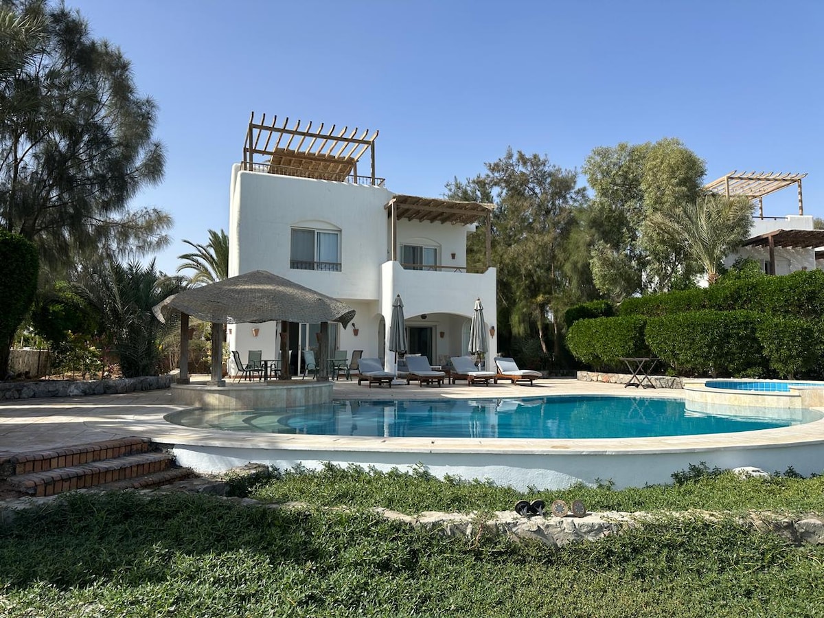 Amazing and Unique in Hurghada, family friendly holiday home or a romantic get away for honeymooners with a large private swimming pool only for you,nothing is shared Spacious livingroom, with open kitchen and toy corner Up, Master bedroom ensuite with shower and a bedroom with kingbed, bunkbed and a Playstation5 Bathroom to fully relax with a big Jacuzzi The villa is fully eqiuped with all what you need We will be honored to welcome you and make your stay amazing and arrange trips for you