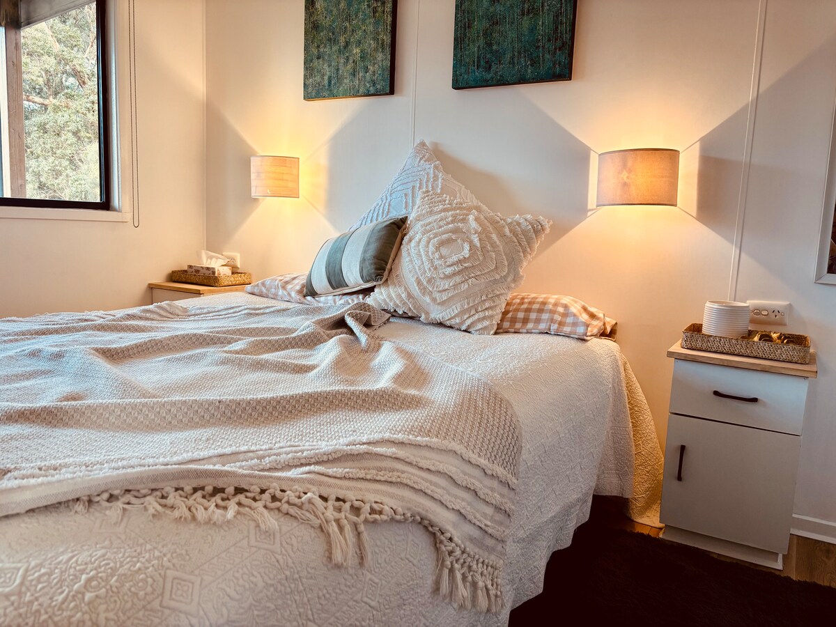 Silver Princess Cottage – Relax & Unwind in Nature This cozy two-bedroom cottage is perfect for couples or small families. Enjoy a wood fire in the spacious lounge, a well-equipped kitchenette, and comfortable queen beds (the second bedroom can convert to twins). The shared Jack-and-Jill bathroom features a rainfall shower, and the private veranda with Weber BBQ invites lazy afternoons surrounded by gum trees.