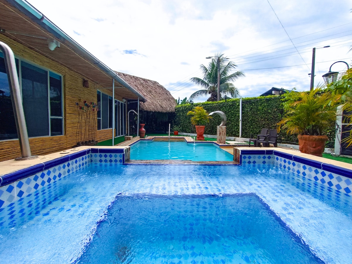 Hermosa casa con piscina privada en clima calido y rodeada de naturaleza. A tan solo 2.5 horas de Bogotá. Cuenta con capacidad para 15 personas. 3 habitaciones equipadas con juegos de cama, 3 baños, sala de estar con sofacama, cocina integral totalmente equipada, nevera, television por cable, parrilla para asados, La zona de la pisicina esta dotada de asoleadoras, silla mecedora, palmeras para sombra, y amplia piscina de 6 x 10 super calida y familiar. Parqueadero 5 autos Espacio camping