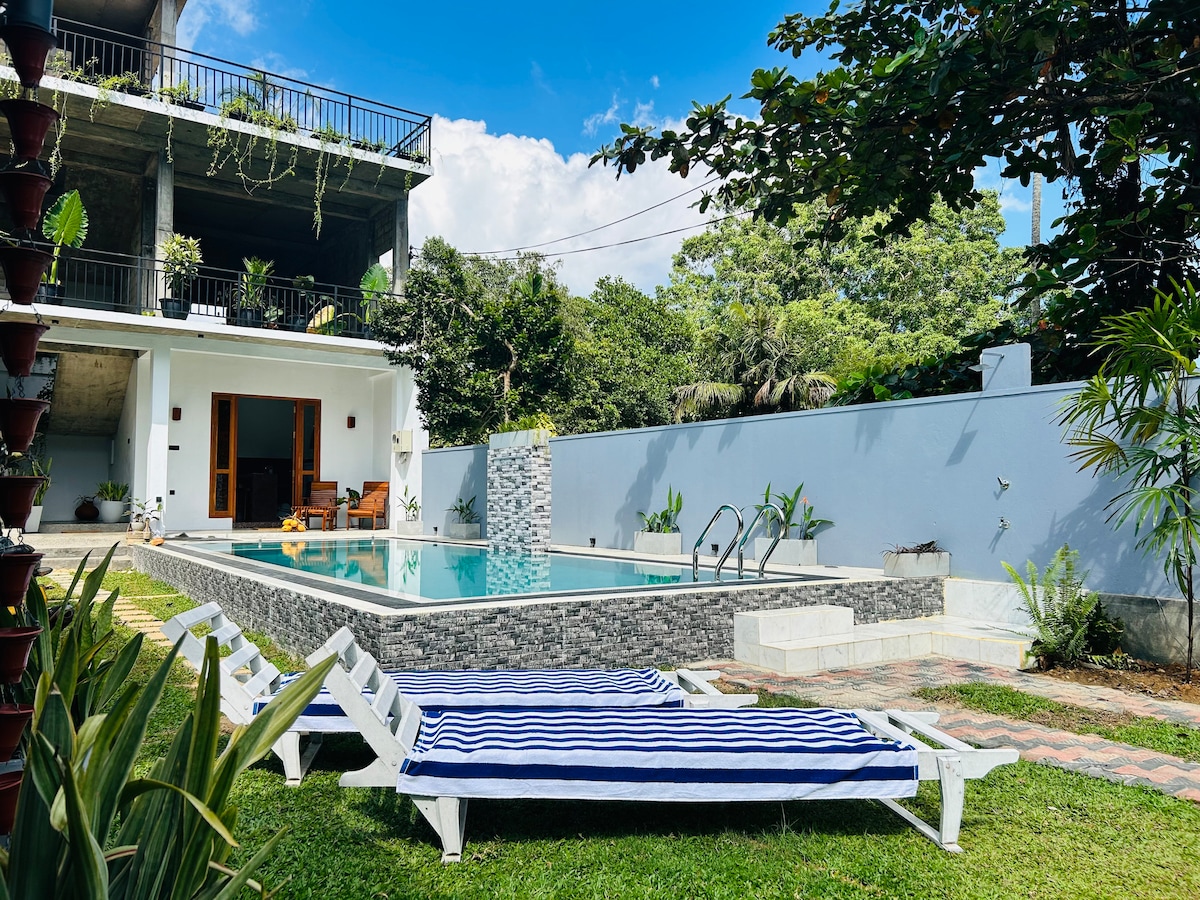 Nature Retreat with Pool A spacious cottage shaded by mango and jackfruit trees in the heart of Hiriketiya Bay. Surrounded by birds and wildlife, it’s a peaceful tropical hideaway for couples, families, solo travelers, and digital nomads. Just a short walk to the beach, with a refreshing swimming pool and garden to enjoy, OurHome offers the perfect mix of comfort, nature, and relaxation for all ages. Ideal for surfing, swimming, or simply unwinding under the tropical sun.