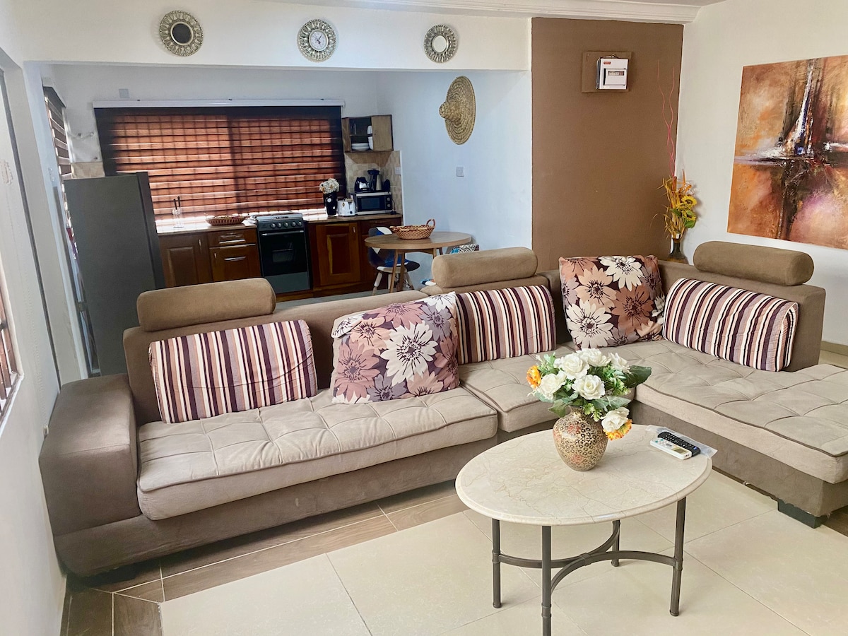 Experience our cozy 1-bed, 1 bath apartment in Accra. Unwind in our stylish living room, fully equipped kitchen - your home away from home. Only 3 miles from Kotoka Airport, convenience is at your doorstep with a pharmacy, African art gallery, offering a glimpse into the vibrant culture of Accra, and a supermarket across the street. Security staff on site and parking is free. Immerse yourself in Accra from this central oasis. Book your stay now and let the adventure begin!