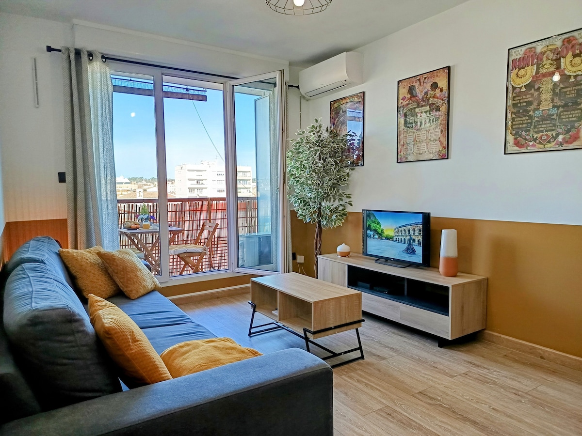 50 m2 en plein coeur de Nîmes, avec vue sur les arènes Nîmoise dans une résidence de caractère qui fut un ancien hôtel particulier Votre voisin d'en face sera ces magnifique Arènes, lieu incontournable de Nîmes. L'appartement dispose d'un lit 140x190 pour accueillir 2 voyageurs. Tout est équipé afin que vous puissiez passer un séjour sans vous encombrer : Assiettes, couverts, serviettes de bain, etc. Il dispose d'une machine à laver, d'un four micro-ondes, et d'une Nespresso à votre disposition.
