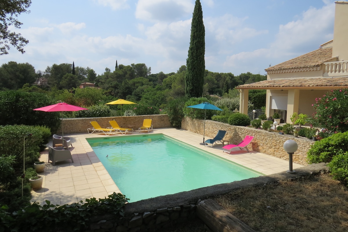 Welcome to Moonfall Villa Guest House, a heaven of peace right next to the heart of the city of Nimes. You are 5 - 8mnt away by car from the city center. Your private charming villa guest house has a separate entrance, fully equipped kitchen, two bedrooms - each room with its own bathroom and toilets, a patio with table and chairs so you can enjoy your meals outside. It overlooks a lush green garden. Besides your own private spaces, you can enjoy the swimming pool and garden of the villa.