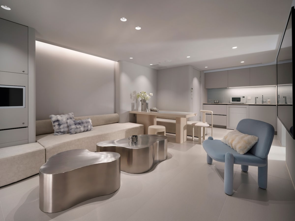 室內的灰白主色,配搭北美木紋銅色傢俱及家飾, 用心為您的居住空間提供沈靜優雅的感覺。日韓系電器的選用,不論是無線充電藍牙喇叭,大螢幕伸縮高清電視,都能滿足您對影音效果的要求。房源位於高樓內縮樓層,阻絕不必要的噪音並滿足您對景觀,安靜及隱私的要求。大樓並配有全天候警衛,住戶專屬電梯,公用大露台,以及地下收費停車場, 位處西門町核心路段,無論搭乘捷運或自駕都非常方便。Earth tone- based interior design offers warming, calm, healing and delighted atmosphere. Room facilities, including double bed, en- suite bathroom with shower enclosure, air conditioning, smart 4K TV with movies/Netflix, WIFI internet, cove lighting and music player with wireless connection & USB charger ports.