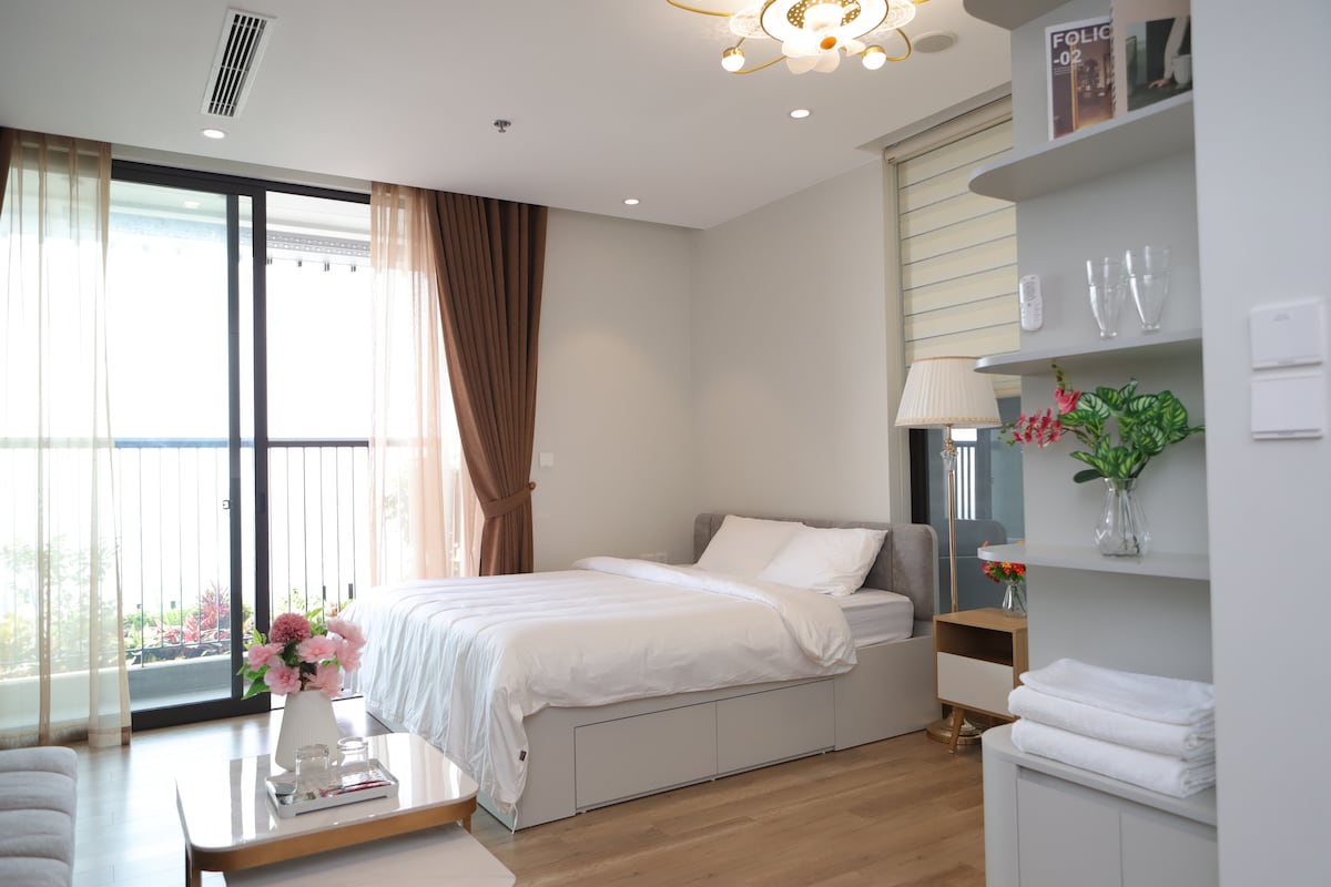 Căn hộ Studio nội thất cao cấp, phong cách Nhật Bản có 1 Phòng Ngủ và 1WC, buồng tắm đứng, thiết bị wc Toto thông minh- tại Landmark 1, Swanlake Onsen, ở vị trí trung tâm bậc nhất tại Ecopark - với tầm nhìn bao quát công viên Hồ Thiên Nga, sông Hồng, làng hoa Phụng Công, kết nối tới các khu vực xung quanh: khu tắm khoáng nóng Onsen, sân golf, học viện golf EPGA, phố ẩm thực, siêu thị, nhà hàng, cafe, phòng Gym, Spa, bể bơi 4 mùa ngoài trời, sân vườn, hồ cá Koi Nhật Bản...