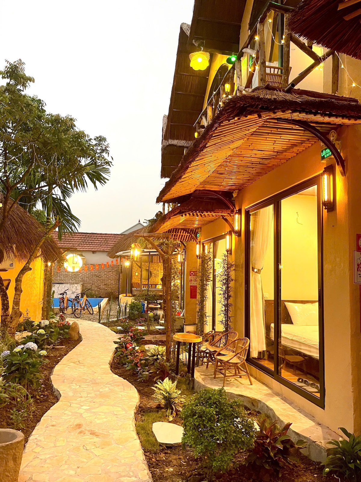 💎 Sora Home bao quanh khu nghỉ là làng cổ truyền thống với hai ngôi nhà cổ nhất Tam Cốc có tuổi lên tới 200 năm, các hàng cau xanh mát, những cụ nhãn lâu năm, chim hót líu lo. Thiết kế phong theo truyền thống đậm chất thiên niên văn hoá Hoa Lư Tràng An, với tường hiệu ứng đất, sàn gỗ, mái lá guộc, hoà quyện giữa những thân cây gỗ và tre trúc tạo ra sự tinh tế cho nơi bạn nghỉ ngơi và sảng khoái nhất! Cách chợ tam cốc 100m, bến thuyền trung tâm tam cốc 500m