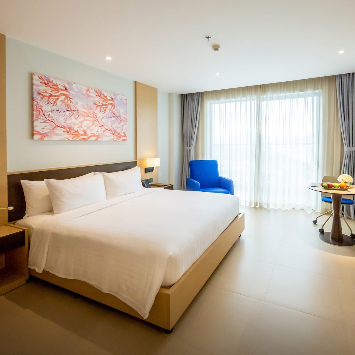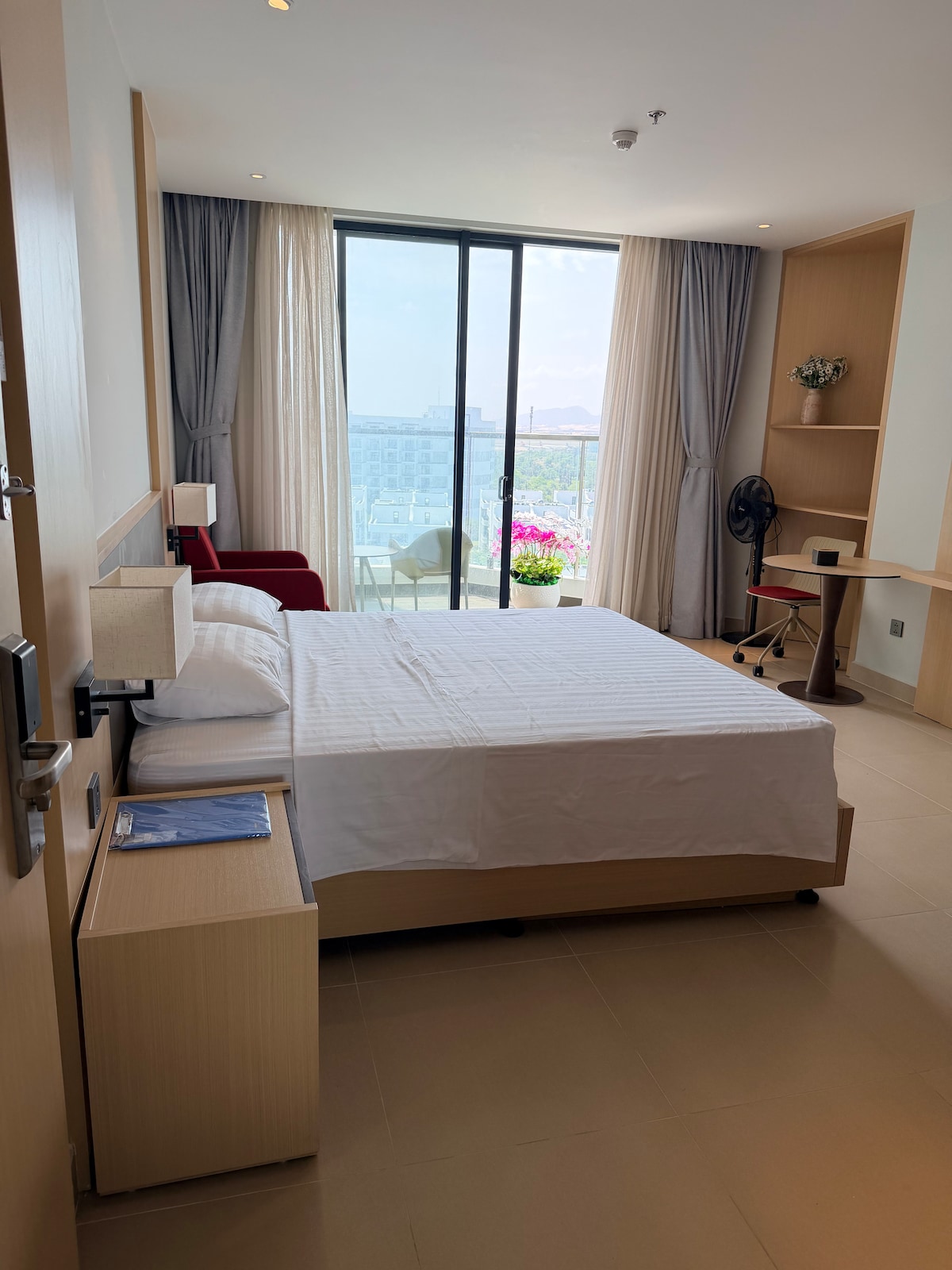 Enjoy a perfect getaway in our stunning ocean-view condotel in Cam Ranh. This modern, sunlit studio offers all the comforts of home. ✨ Highlights: • Private balcony with panoramic sea views. • Plush King bed & relaxing L-shaped sofa. • Handy kitchenette (microwave, fridge). • Smart TV & high-speed Wi-Fi. Wake up to breathtaking sunrises right from your bed and enjoy the fresh ocean breeze every day!
