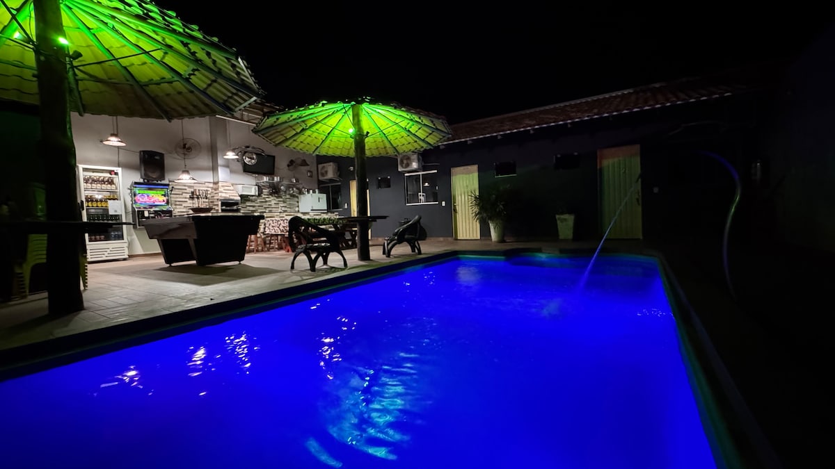 • rancho privativo com estacionamento • 3 quartos suítes • piscina com cascata e hidromassagem. • área gourmet completa com todos utensílios de cozinha, também possui geladeira, freezer e cervejeiro. • mesa de sinuca e jukebox com karaokê.