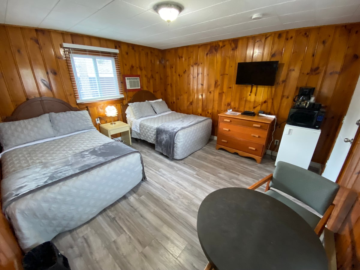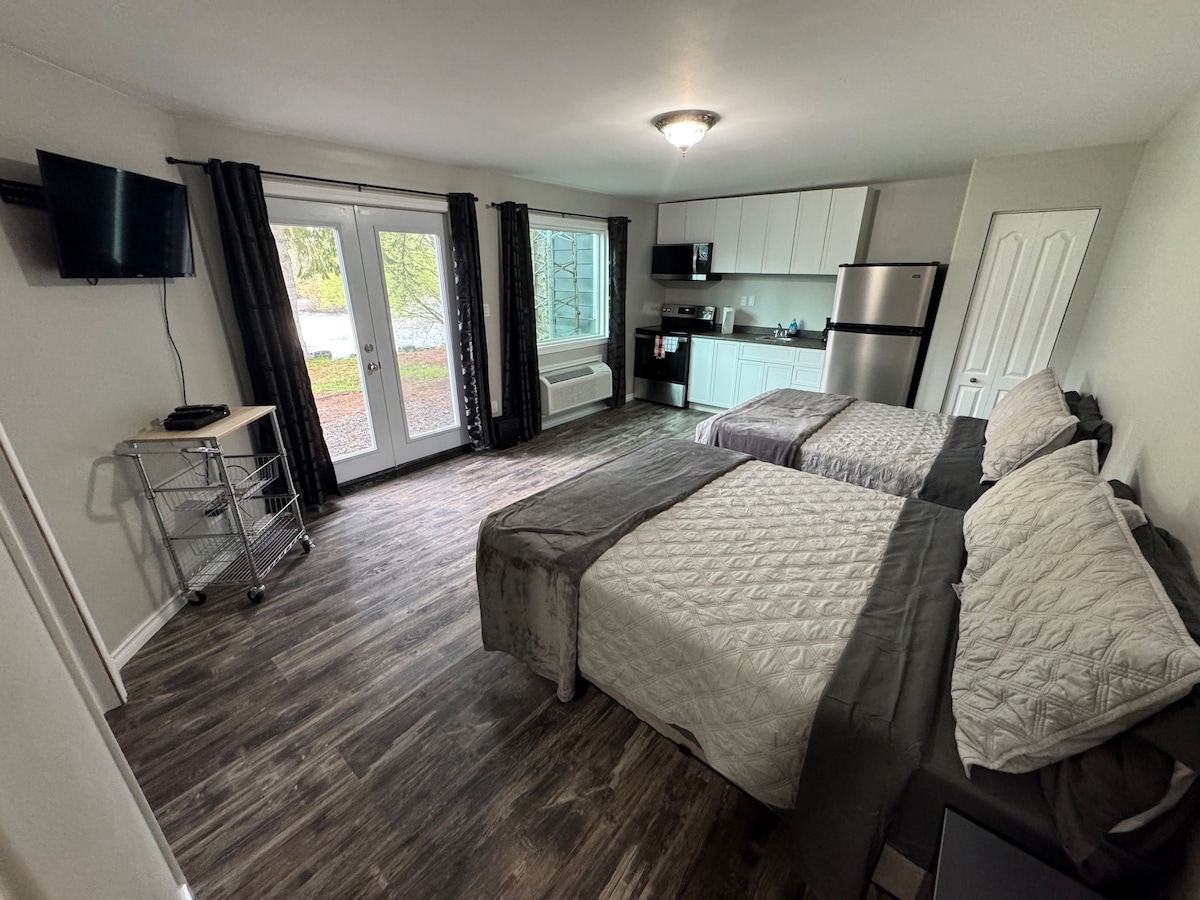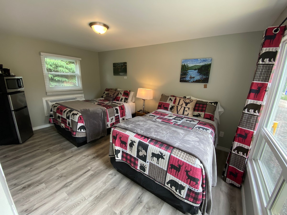 This waterfront unit features a private patio and was newly renovated in spring 2025! Room Two is a one-bedroom unit with a two double beds, an accessible 3-piece luxury bathroom, and a kitchen with a full-size fridge, stovetop, microwave, coffee maker, and air conditioning. Enjoy a TV with satellite service, free Wi-Fi, and complimentary use of the picnic area and fire pit by the beautiful Madawaska River.