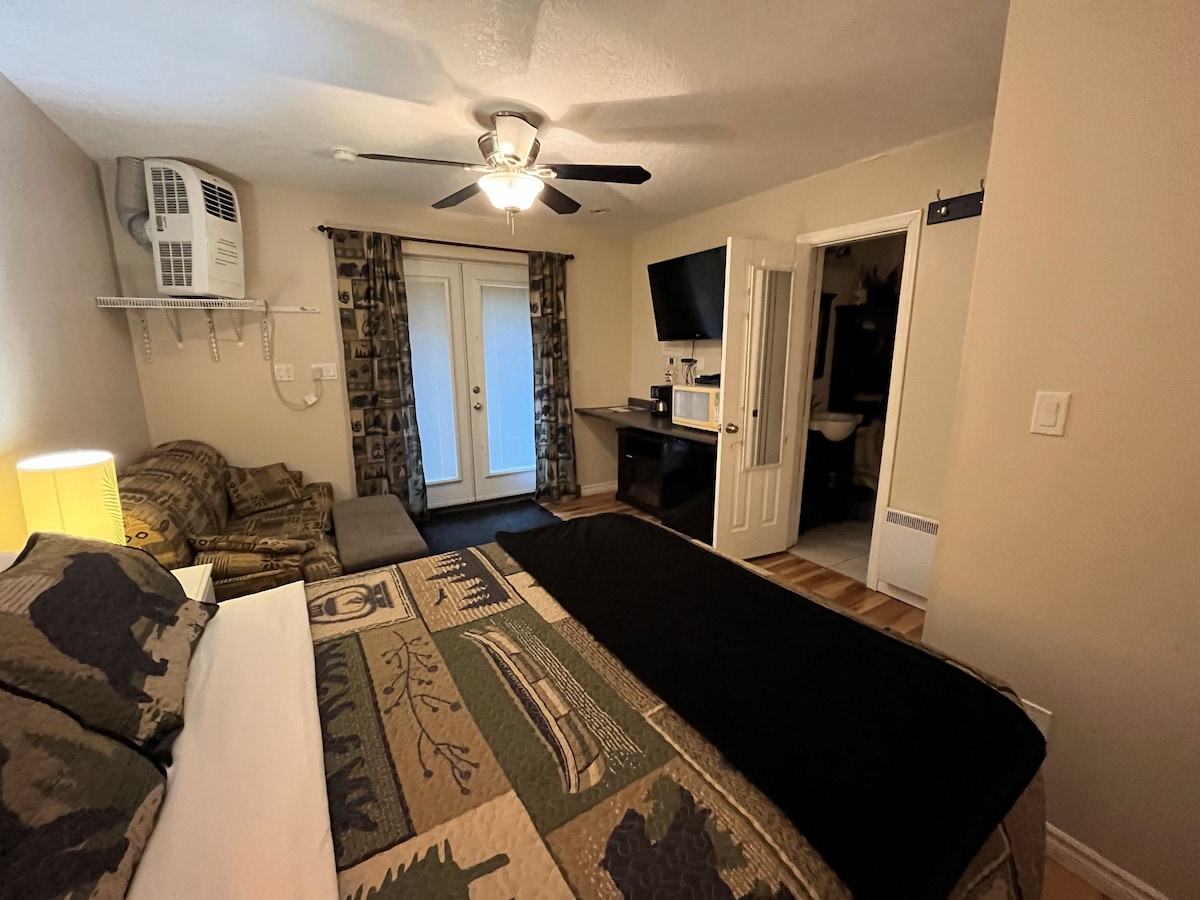 Newly renovated Room Eleven, features 1 King bed, a private 3-piece bathroom, and a large screen TV, fridge, microwave, coffee maker, and heat/AC. It's now more accessible with grab bars, wider doors, and a barrier-free shower. Enjoy a worry-free stay in this thoughtfully designed room while experiencing the stunning scenery to the fullest from a patio facing the river.