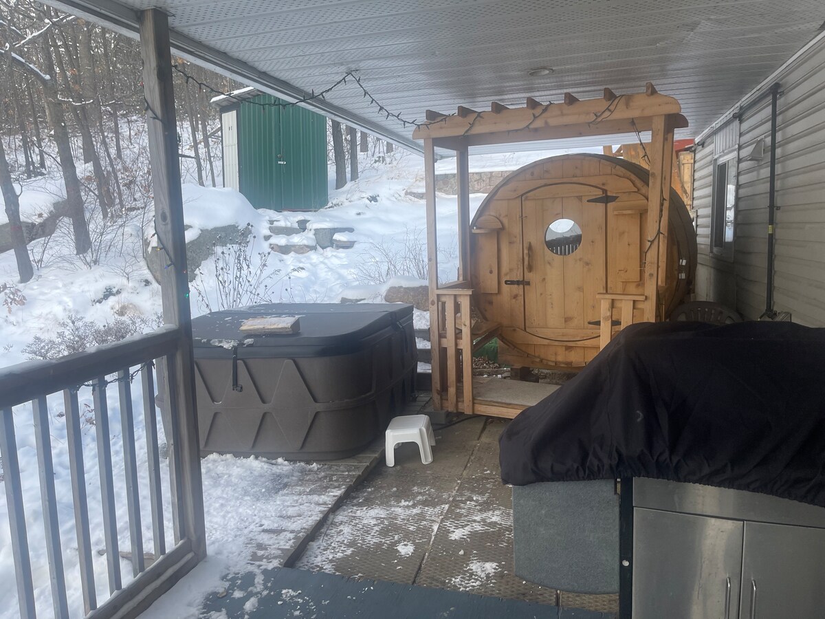 True cottage with HOT TUB next to whiskey barrel Sauna both located on great tall deck to watch million dollar views of Kameniskeg lake and the hills! Two renovated bathrooms with new soaker tub & rainshower! Wood burning fire place and a jacuzzi tub to keep you warm and entertained inside. Two floors specious True cabin feel cottage. Short trip to Algonquin. Beautiful scenic winter, including tobogganing on site. Best lake in the Area: Kameniskeg and Madawaska with over 90mls of water way.