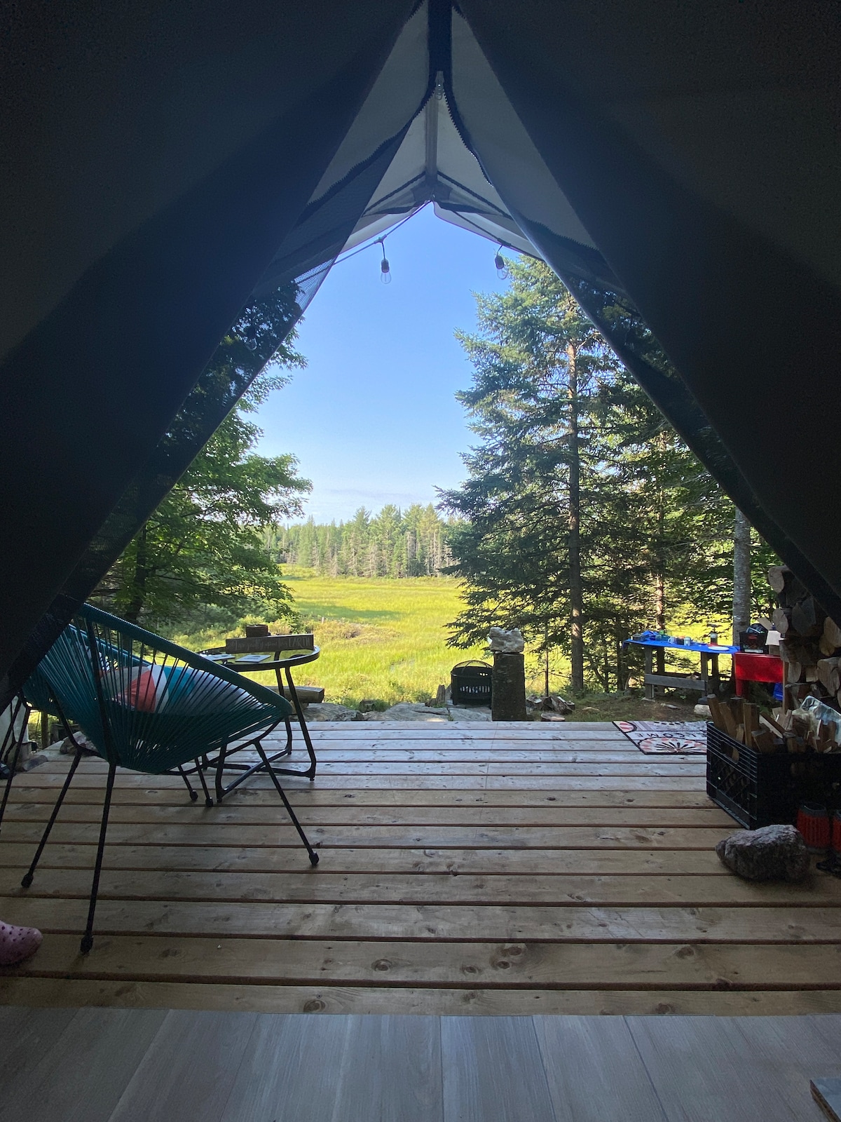 Escape to our secluded glamping tent nested in the heart of the forest but only 5 min. walk from the highway. Experience breathtaking forest views, cozy campfires and unparalleled stargazing! The tent is accessed by a short hike from the parking spot. A creek runs towards the back about 100m from the site. Enjoy your Welcome Amenity of Plantain Salve and Pace Counter. Experience our backcountry glamping luxury tent near lakes, rivers, farms and more!
