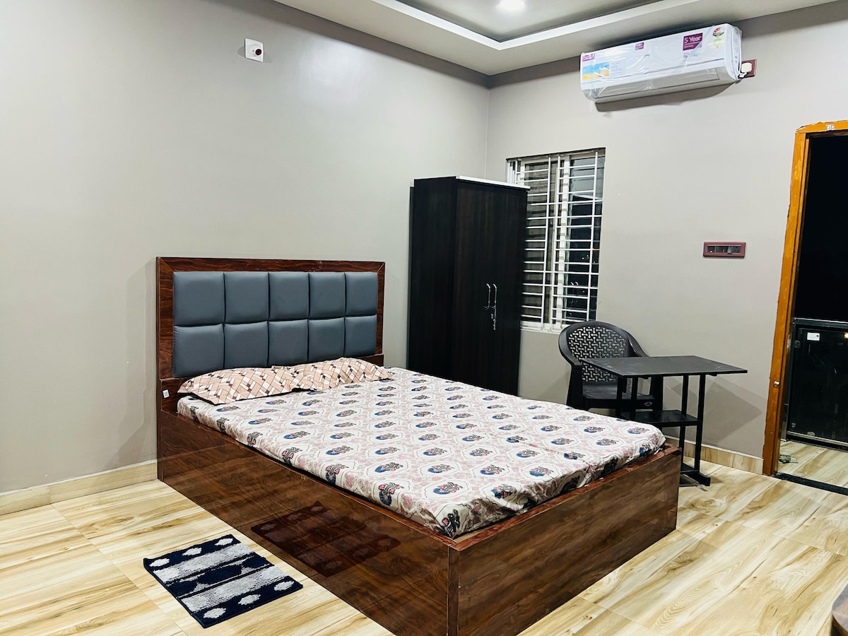 Fully furnished spacious 1-bedroom (530 sq ft) located at Laxmi Nivas, Chakratirtha road, Puri. Centrally located : 1min walk to the beach & 10 mins ride to Shree Jagannath Temple. Room on 1st floor - no lift Perfect for couples,friends or a family of 3. Kitchen(breakfast, tea, reheating food),Wi-fi,AC,1 full sized bed & single bed, geyser, balcony,dining table. Power backup available. Parking - subject to availability.Need to inform beforehand. Bike/Car rentals available nea