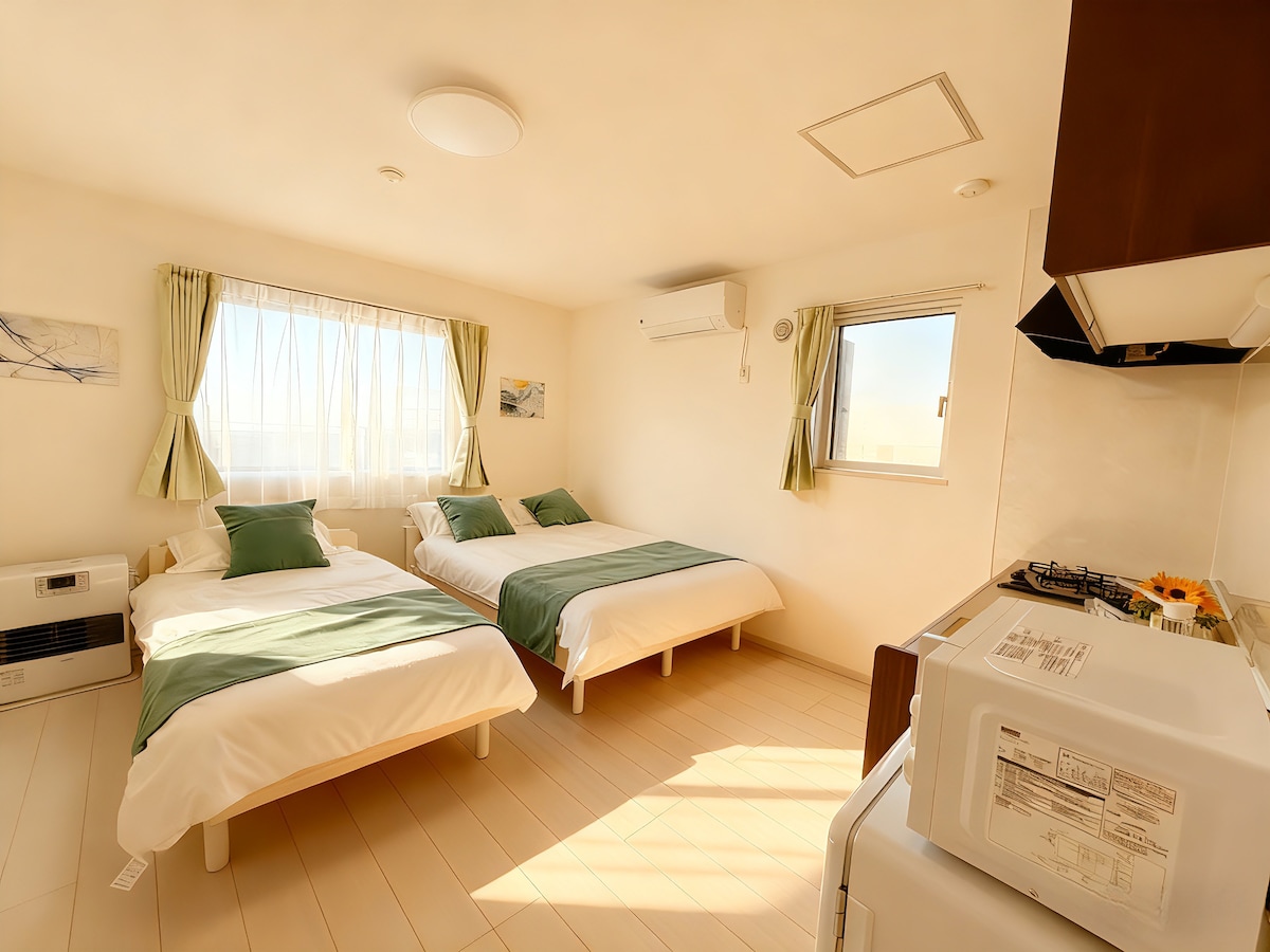 This is a hostel-style inn called "Matcha house" for those who want to stay in Niseko at a reasonable price and enjoy skiing and snowboarding. Good location, 5 min by bus from Grand Hirafu Ski Resort. Free shuttle bus operate around this area in winter season. All rooms are private rooms (lockable), not shared rooms. The room is fully equipped with a TV, table, chairs, heating and hangers. The shower room and toilet are shared. Extra towels can be rented (bath towel 200 yen).