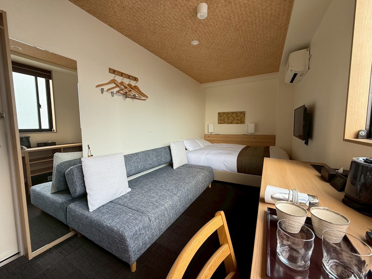 This spacious 34.58㎡ room is equipped with 1 double bed, 1 single bed and 1 sofa bed and can accommodate up to 4 guests. This apartment hotel combines the history of Kyoto with modern comforts. All 32 spacious rooms are equipped with kitchens, washing machines, and high-speed WiFi, making them ideal for long-term stays. With easy access from Kyoto Station, the hotel is a convenient base for both sightseeing and business.