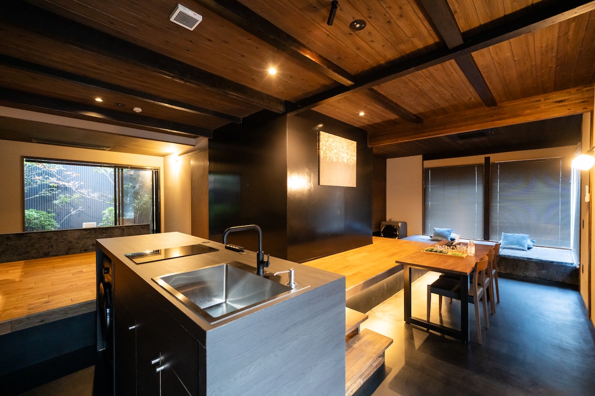 京町家貸切宿「高瀬川七条」は築115年の京町家をフルリノベーションした宿泊施設です。京都の美しい風景を形作る京町家を、当時の構造を残したまま、京都特有の蒸し暑い夏、底冷えの厳しい冬にも快適にお過ごしいただけるよう、気密性・断熱性能の高い建物に仕立て直しました。 1階の和室からは『露地』(※茶室へ通じる庭)をイメージした坪庭をご覧いただくことができます。また、廊下にはゆったりとくつろぎながら坪庭を眺めることができるようソファをご用意しました。夜にはライトアップされた坪庭を眺めながら、癒しの時間をお過ごしいただけます。 2階には寝室が2部屋あり、シングルベッド2台の部屋とダブルベッド1台の部屋をご用意しました。 5名様以上でご宿泊の場合は、少しご面倒ですが1階の和室にお布団を敷き、寝室としてご利用いただきます。 キッチンには簡単なお料理ができるよう調理器具と食器のご用意がございます。