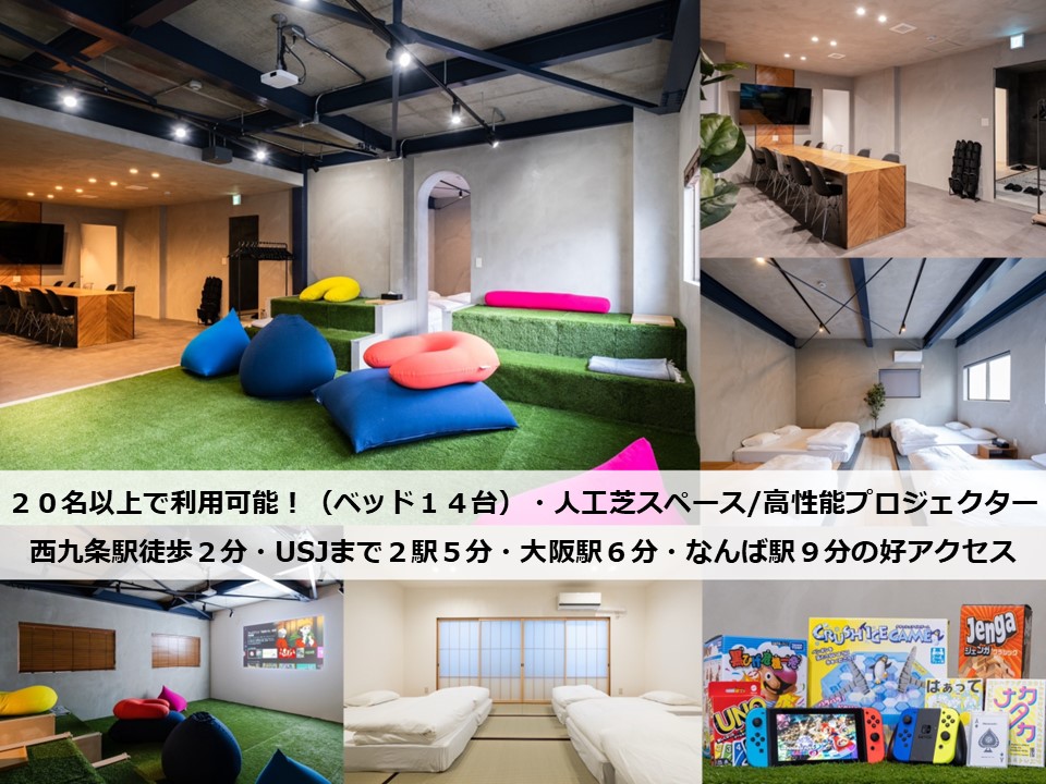 距离日本环球影城和大阪站7分钟!靠近车站的好位置!可供20人以上使用(14张床)/人造草坪空间团体聚会【wj】