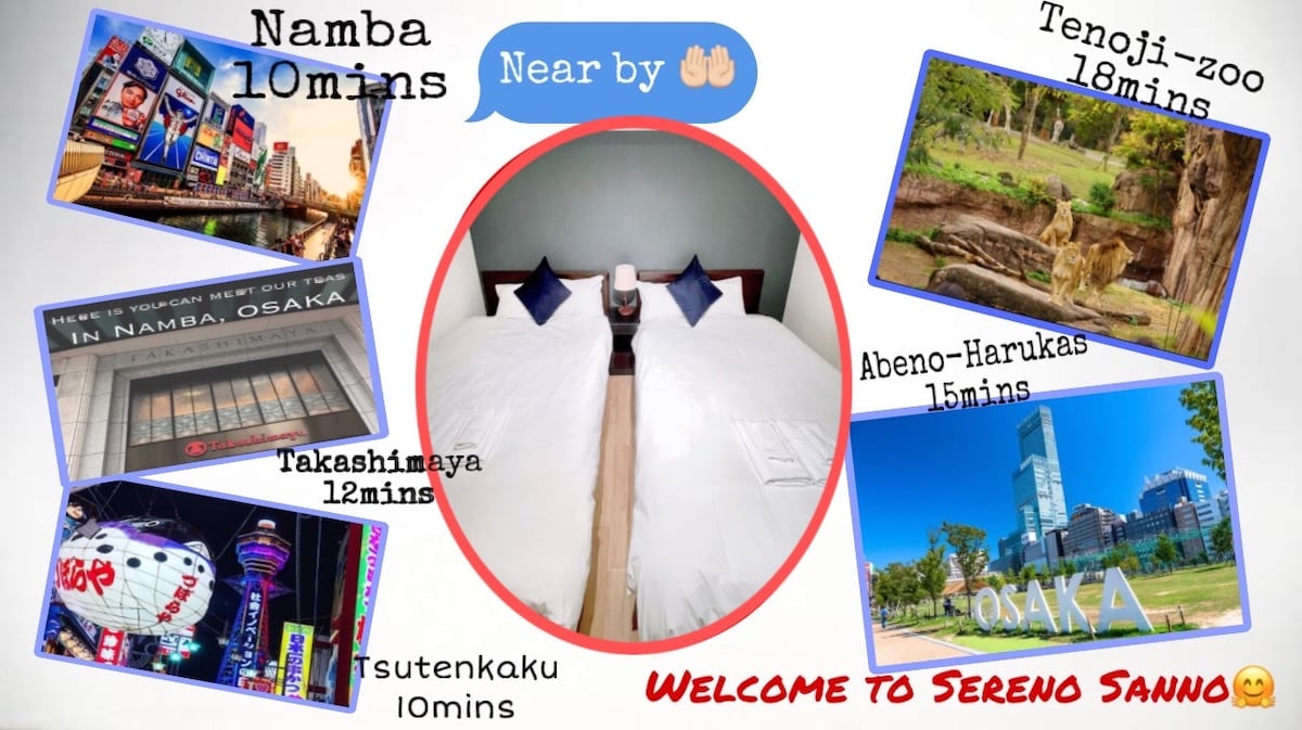 感谢您的光临。 民宿位于大阪市中心的难波商业区和天王寺商业区附近,最近的车站是花园町地铁站和萩之茶屋南海火车站。步行分别仅需要1-5分钟。 民宿出发3分钟可抵达附近的综合超市,便利店,药妆店及餐饮店。 设施距离天王寺动物园和新世界仅有1500m步行路程,强烈推荐给有孩子的家庭。 周围的商业街有很多美食店铺。可以欣赏阿倍野Harukas地标的风景! ! ! 房间面积为 28平方米,最多可容纳 4 人。 (2 张双人床 )。厕所和浴室是相互分开的。 房间内配备有电视、空调、电冰箱、微波炉、电热水壶、吹风机、无线Wi-Fi等设施齐全,让您随时空手入住。 我们期待着您们的光临。