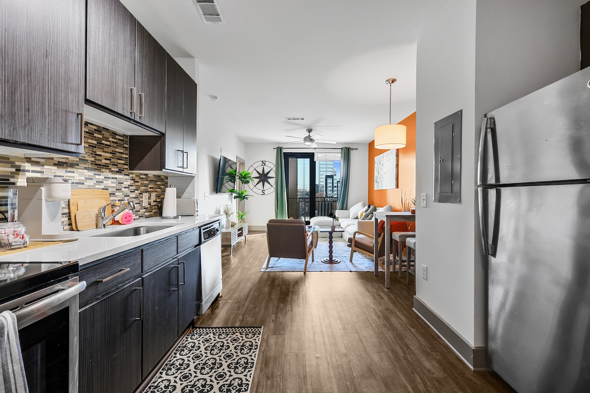 Welcome to Pine Street Flats! Our 1 bedroom is a modern haven situated on the 2nd floor of our building in the heart of the Gulch neighborhood in downtown Nashville. • Walkable to restaurants, coffee shops, & shopping • 1 mile from HONKY TONK ROW! • Saltwater Swimming Pool • Gym • Free Wi-Fi & Smart TV • Full Kitchen • Queen sofa bed! • Secure & Covered Paid Parking available for $40/day with in and out privileges Perfect location to explore Music City! PERMIT# Listed in Pictures