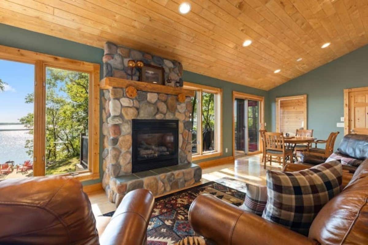Escape to Leisure Lodge, 2 hrs from MSP or Fargo: • 4 king beds, 4 Twin XLs, pullout queen, portable crib • 3 baths (one on each level) • Fully stocked kitchen w/ indoor & outdoor dining for 10+ • Spacious year-round home with indoor garage parking, not a seasonal cabin • Hot tub + fire pit w/ wood • Paddleboat, kayaks & nearby trails • Cozy gas fireplace & crisp lake views • 120+ five ⭐️ reviews •Decorated w/ indoor lighted trees throughout the winter for groups to celebrate holidays
