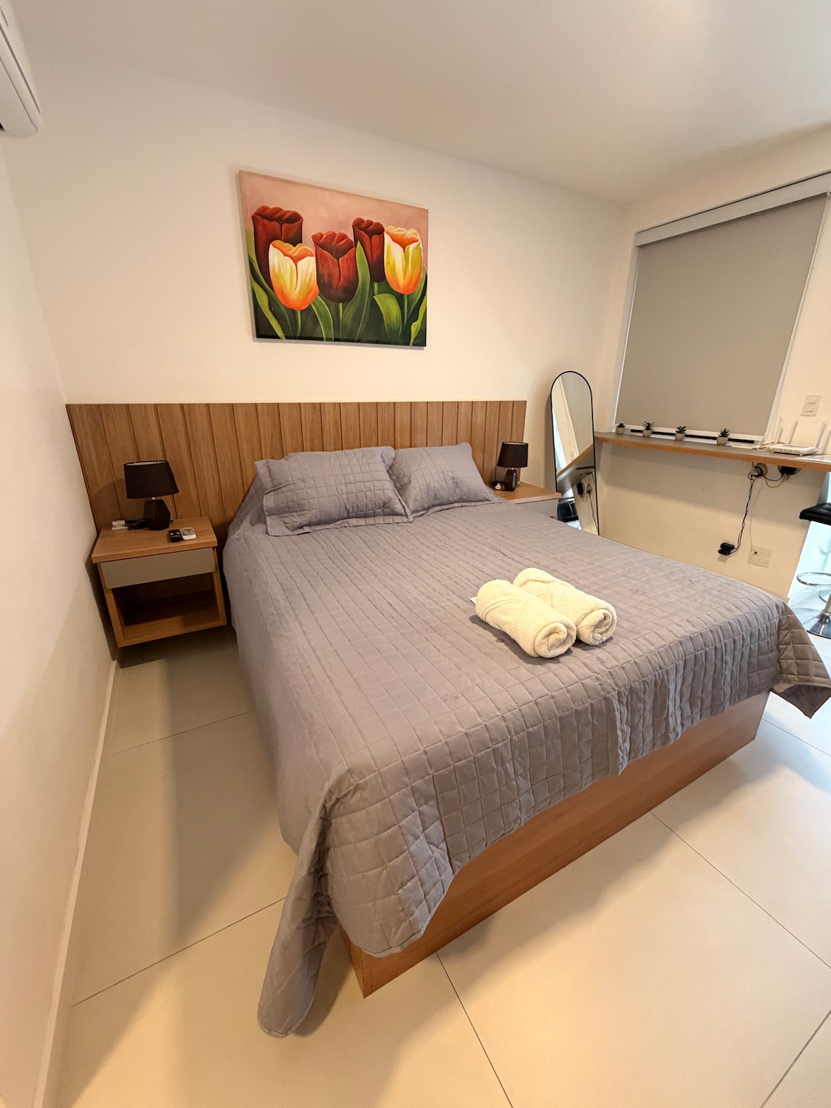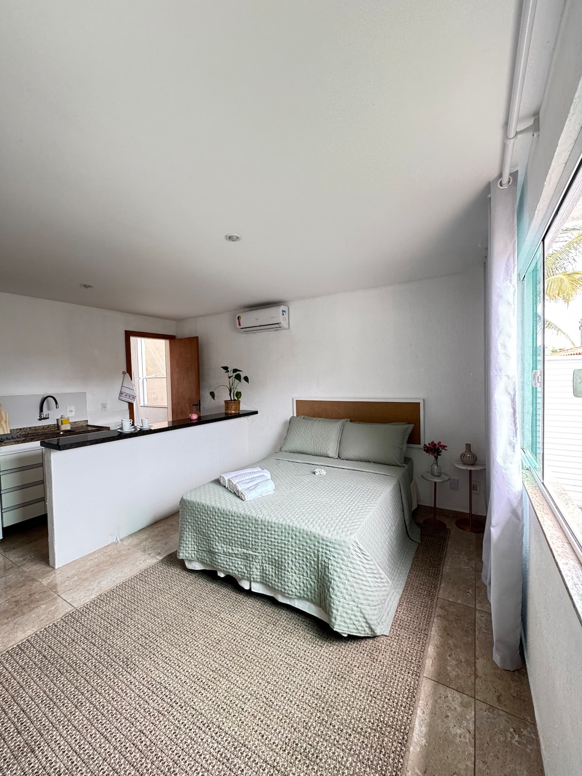 Sobre o imóvel: - Studio com 25m²; - De 12 a 15 minutos caminhando até à praia; - Garagem privativa; - Acomoda confortavelmente até 3 pessoas; - Varanda espaçosa. Destaques: - Wi-fi de alta velocidade; - Ar condicionado e ventilador de teto para seu conforto; - Smart TV; - Cozinha equipada com cooktop por indução duas bocas, forno elétrico, microondas, air fryer, sanduicheira, cafeteira dolce gusto, cafeteira elétrica e liquidificador.