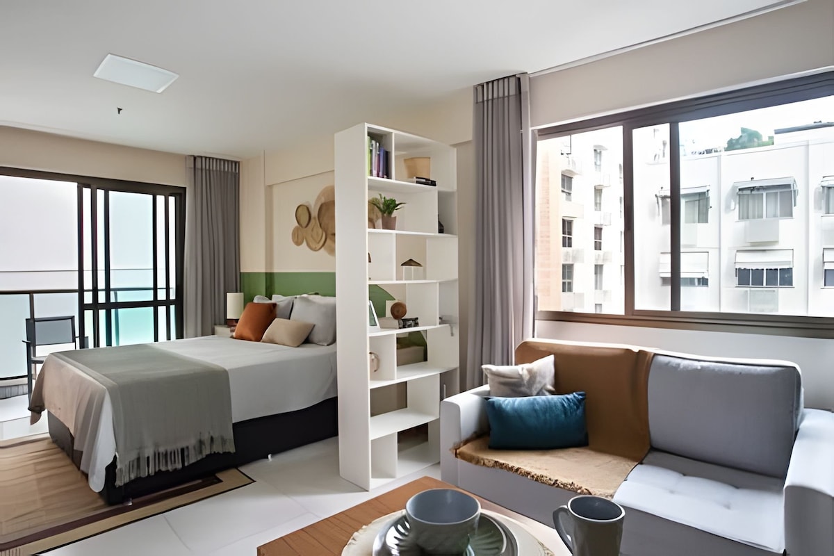 The stylishly decorated loft features an open concept with a wooden divider separating the bedroom from the living room and kitchen. It has 2 TVs, one in the bedroom and one in the living room. With a comfortable double bed, many windows bringing in natural light, a kitchen integrated with the living area, and a spacious L-shaped balcony with a surreal view of Icaraí Beach. Fully equipped, it's 200m from the beach, close to pharmacies, a market, restaurants, and the most famous street in Icaraí.