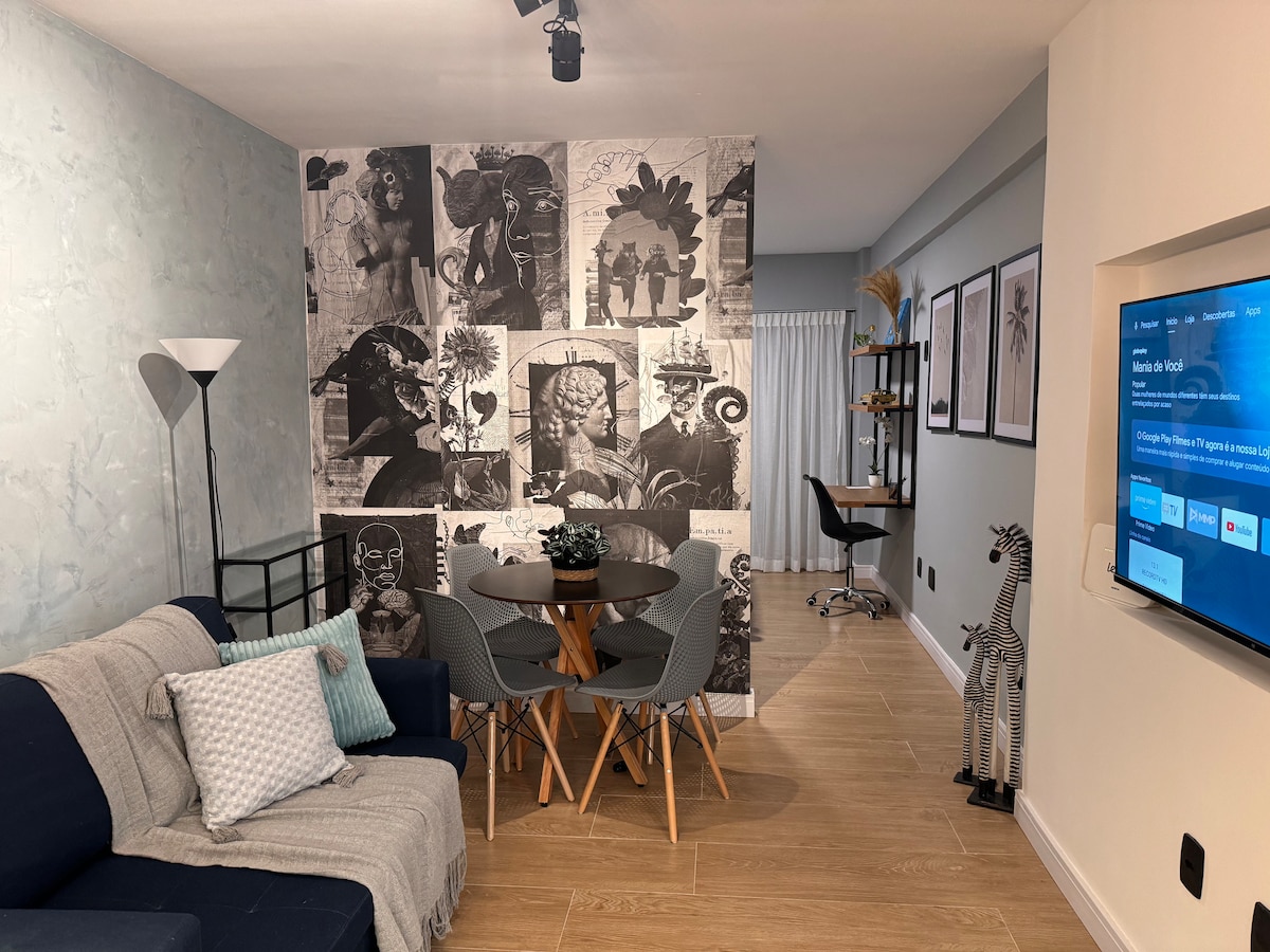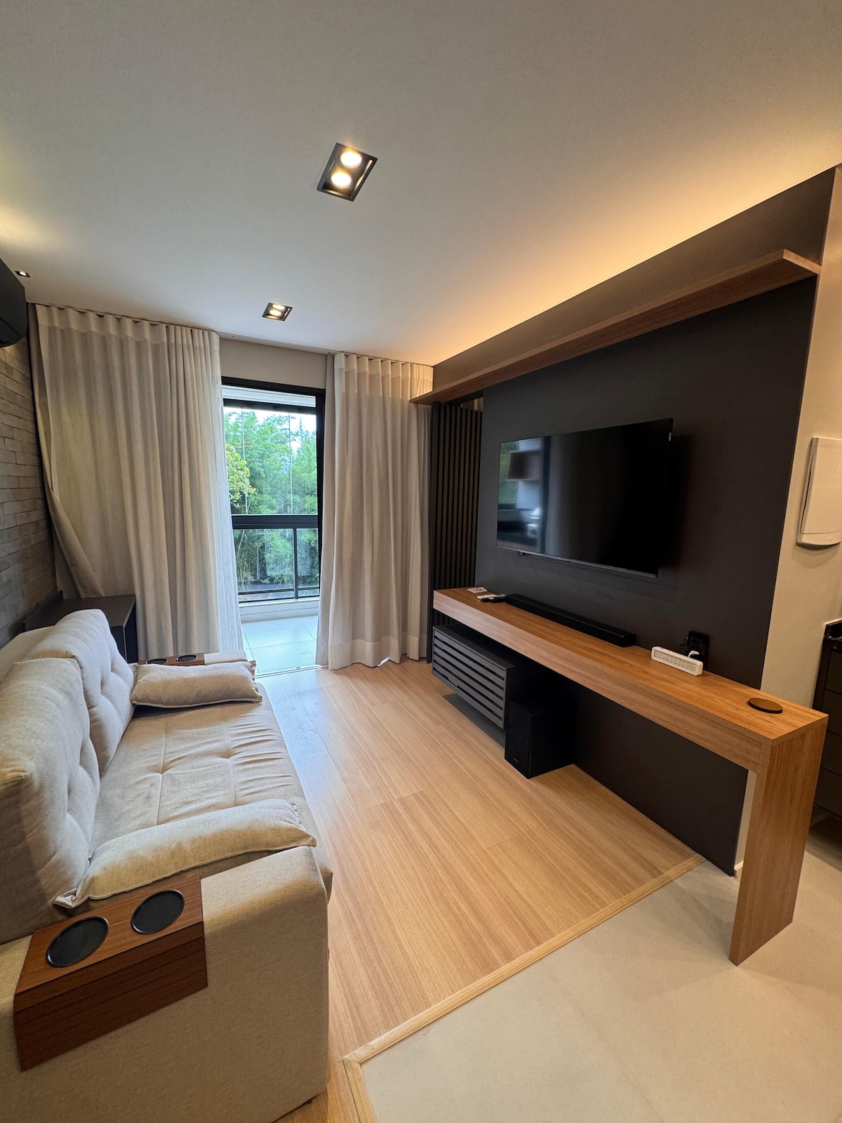 Ideal para quem busca estilo com sofisticação e muito conforto! Cama King, tomada, USB e arandela de leitura em ambos os lados TV 75" Smart Sofá cama muito confortável Varanda Gourmet Ventiladores de teto Ar condicionado 24000Btus Cozinha completa Chuveiro duplo fluxo de água Armário com 3 portas e espelho corpo inteiro Filtro de água potável (torneira cozinha) Fogão por indução Lavanderia no Prédio Internet de 500MB Roupa de cama e banho (Padrão Hoteleiro) Recém montado - Início Out/24