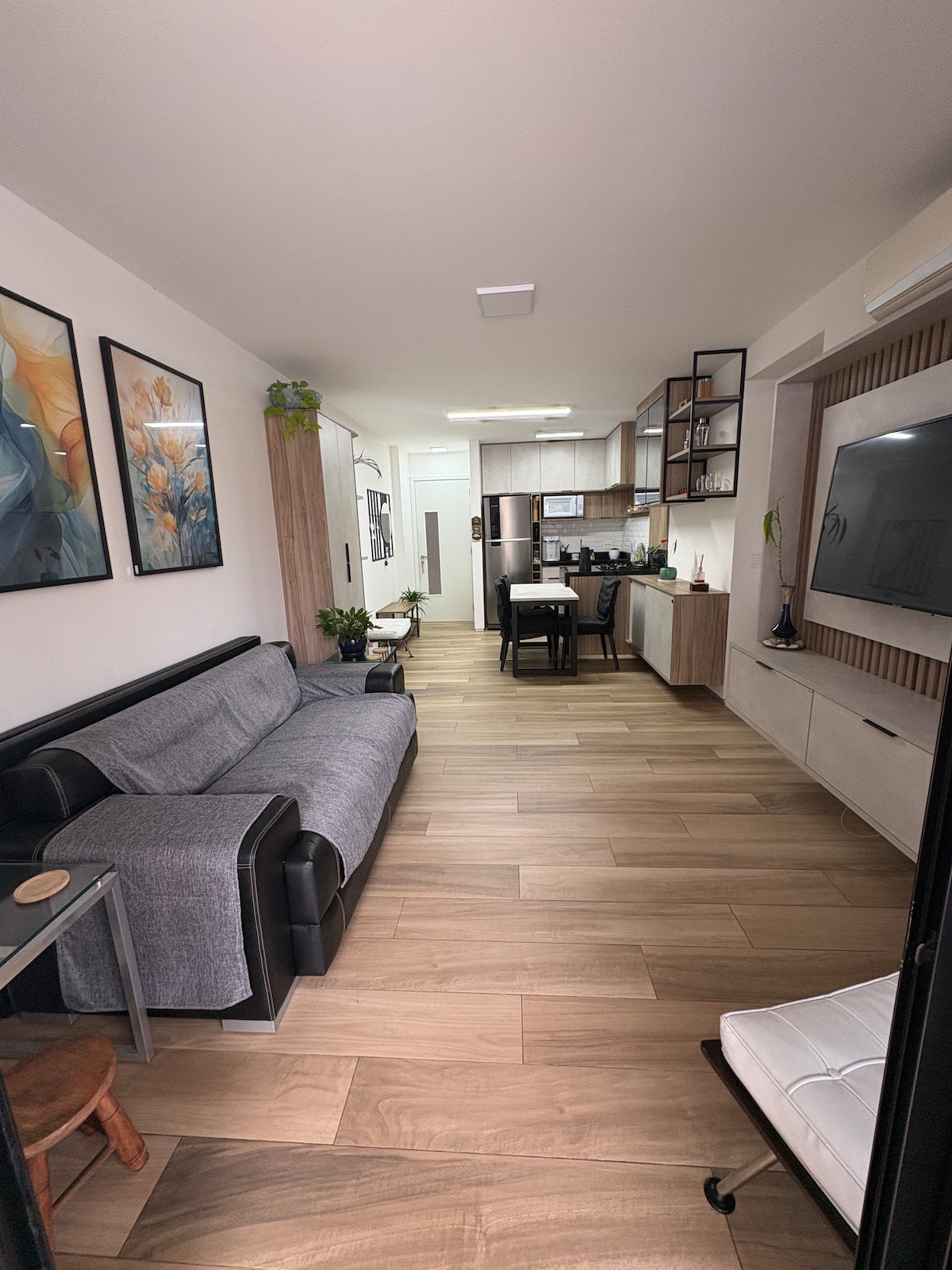 The stylishly decorated loft features an open concept with a wooden divider separating the bedroom from the living room and kitchen. It has 2 TVs, one in the bedroom and one in the living room. With a comfortable double bed, many windows bringing in natural light, a kitchen integrated with the living area, and a spacious L-shaped balcony with a surreal view of Icaraí Beach. Fully equipped, it's 200m from the beach, close to pharmacies, a market, restaurants, and the most famous street in Icaraí.