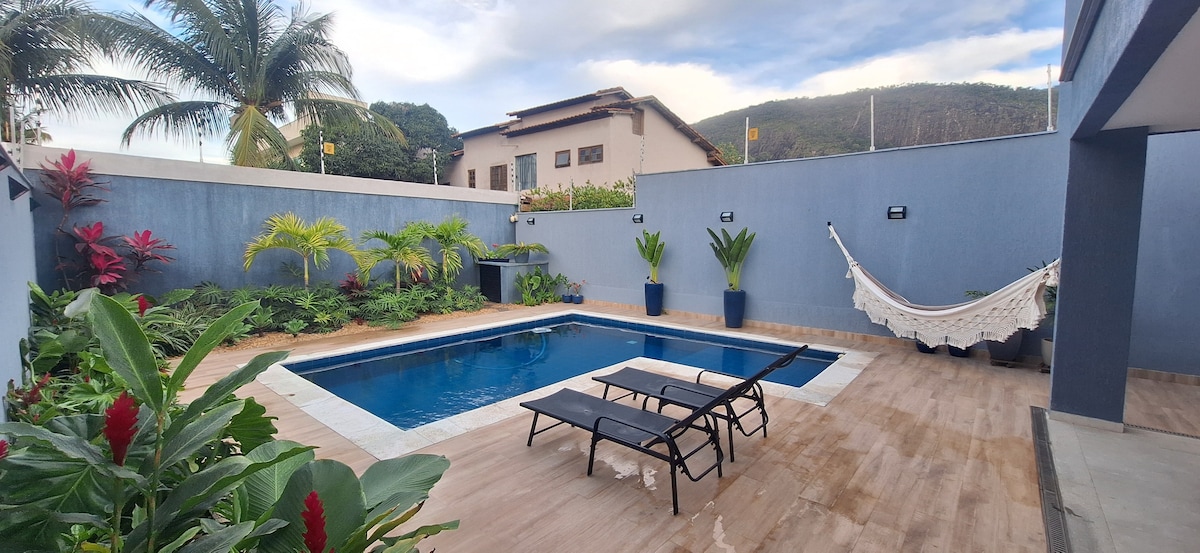 Linda e ampla casa 20m da melhor e mais bonita praia da Região Oceânica em Niterói. 3 suites, dois quartos, banheiro social, lavabo, sala 2 ambientes, TVa cabo, Wifi, ar cond. e ventiladores em todos os quartos, cozinha, lavanderia, garagem 5 carros, churrasqueira, piscina, empregada (a combinar) Bairro monitorado/ câmeras 24h / única entrada controlada. Comércio e transporte. Restaurantes bares, trilhas, caminhadas / outras praias. RELAXE * NATUREZA * TRANQUILIDADE * SEGURANÇA * CONFORTO