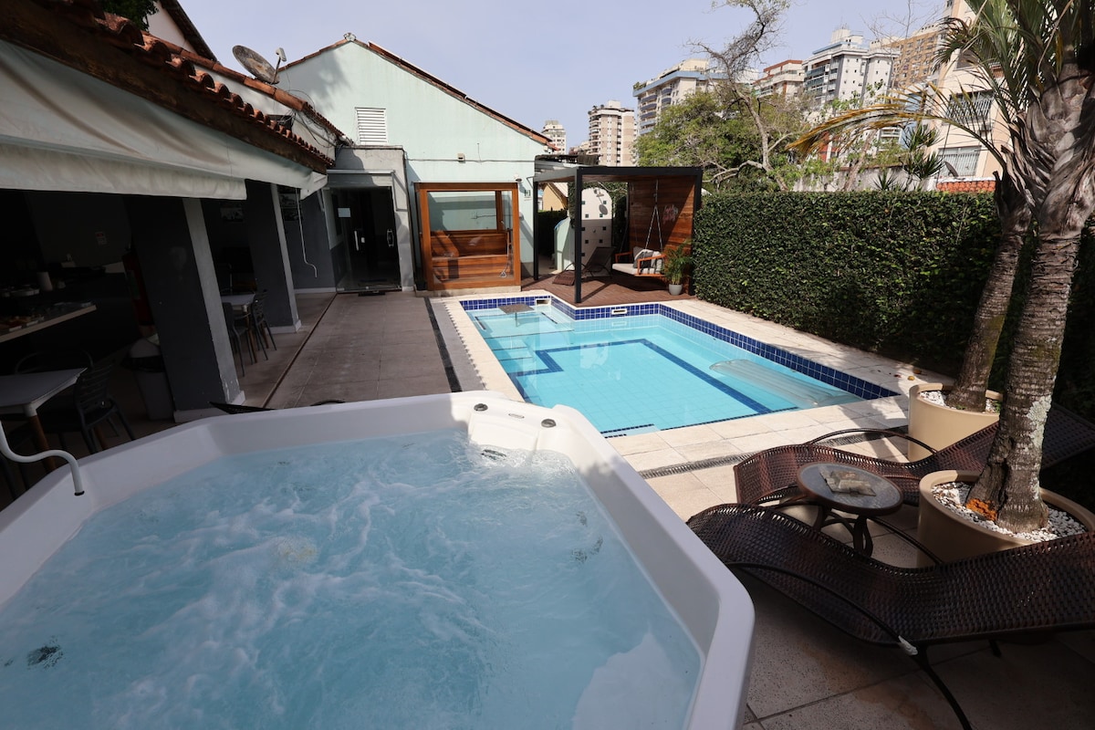 Suite privativa com banheiro privativo para até 4 hóspedes com uma cama de casal queen e um beliche com 2 colchões de 1,88 x 0,88m. A suite dispõe de Wi-Fi, tv smart com claro tv, frigobar, fechadura eletrônica, armário tipo locker e cabides, ar condicionado e banheiro com chuveiro elétrico. CAFÉ DA MANHÃ INCLUÍDO NA DIÁRIA A pousada também oferece piscina, jacuzzi, sauna, cozinha, jardim, garagem(cobrada à parte) sala de tv (TODOS ESSES ESPAÇOS DESCRITOS SÃO DE USO COMUM DE TODOS OS HÓSPEDES)